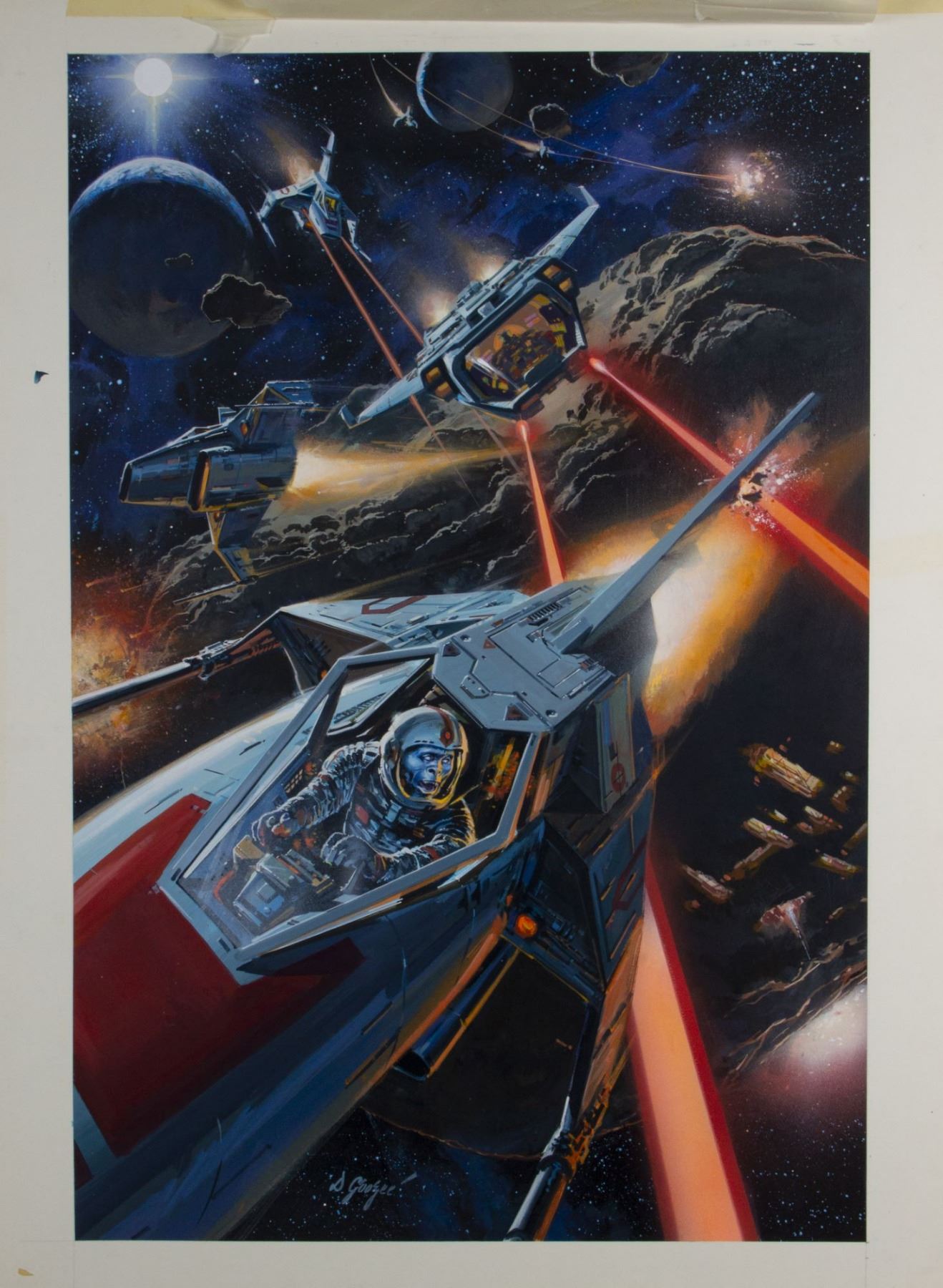 (Thought Factory, c.1977) An original painting by award winning visual effects artist and painter Dan Goozee. Titled "Intercosmic Combat", this original artwork was used in a series of science fiction posters that were created and marketed by a partnership between Bill Wallen and Thought Factory in the late 1970s. The painting comes from Wallen's personal collection, and Goozee's influence from "Battlestar Gallactica" and "Star Wars" can clearly be seen throughout this stunning original painting. The artwork has an image size of 34"x23" on 40"x30" art board, and the condition is very good with some wear to the edges and white margin areas. There is a protective paper cover hinged over the top of the artwork. Goozee has signed the bottom-edge of the artwork.
