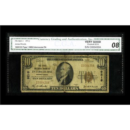 <B>Intercourse, PA</B></I> - $10 1929 Ty. 1 <B>The First NB</B></I> Ch. # 9216<BR>Although the census from here now stands at 40 of the 1929 series, only two, including this addition, are the $10 Ty. 1. A <B>CGA Very Good 08</B></I> from an always in demand locale.<BR><BR><b>Shipping:</b> Coin/Currency (<a target="_blank" href="http://www.heritageauctions.com/common/shipping.php">view shipping information</a>)