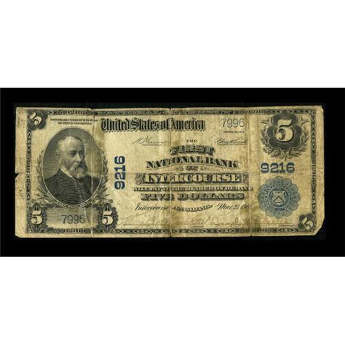 <B>Intercourse, PA</B></I> - $5 1902 Plain Back Fr. 600 <B>The First NB</B></I> Ch. # 9216<BR> This bank is on the top of most collectors' want lists. Somebody in the distant past came across this $5 with the interesting bank title in circulation and used it as a wallet piece. This accounts for this note surviving. This <B>Very Good</B></I> example has three large contemporary tape repairs on the back. However, this has preserved the face a little better than the back. We have sold a couple of Fines on this bank for between $4100 - $4300 in 2004 and 2005 and expect this note to hammer down at. . .<BR><BR><b>Shipping:</b> Coins & Currency (<a target="_blank" href="http://www.heritageauctions.com/common/shipping.php">view shipping information</a>)