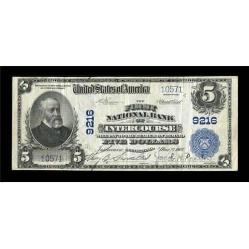 <B>Intercourse, PA</B></I> - $5 1902 Plain Back Fr. 600 <B>The First NB</B></I> Ch. # 9216<BR> A highly desirable charter for any collector of Nationals. This example is a bright <B>Very Fine+</B></I> with natural paper surfaces, sound edges, and rubber stamped signatures of Harry B. Showaiter and Jacob K. Ressler. We have sold a couple of notes graded Fine on this bank for between $4100 and $4300 in 2004 and 2005 and expect this note to hammer at least in the range of...<BR><BR><b>Shipping:</b> Coins & Currency (<a target="_blank" href="http://www.heritageauctions.com/common/shipping.php">view shipping information</a>)