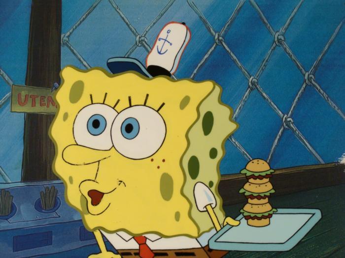 This animation cel and reproduction background are from the Nickelodeon TV show SpongeBob Squarepants. The story takes place under the deep blue sea in Bikini Bottom, where SpongeBob resides. SpongeBob, who is a yellow, porous sponge, is your typical happy-go-lucky character, as he is always cheerful and enjoys making people laugh. Patrick Star, SpongeBob's neighbor who is a starfish, is your average children's show idiot, as he boasts knowing nothing and is often getting himself into ridiculous situations. Between the homes of these two lies the home of the miserable Squidward, a squid, who is known for being grouchy and playing tricks on SpongeBob and Patrick. Both SpongeBob and Squidward work at the Krusty Krab, a fast food business run by the greedy money-loving Mr. Krabs, a crab, the arch rival of the evil, possibly misunderstood, Plankton. Another neighbor, Sandy Cheeks, an athletic squirrel who normally wears an astronaut's space suit, was introduced in "Tea at the Treedome." She spends most of her time inventing and experimenting. SpongeBob looks interested.Original Printed Background and Animated Cel Overall Size of Background: 11" x 17" Overall Size of the Cel: 10 1/2" x 12 1/2" Very good condition This is an original hand-painted cel set-up used in the production of an episode of "SpongeBob SquarePants." Each one-of-a-kind set-up represents a slight change in position of the characters. When individually photographed and projected in rapid succession, the images appear to move.