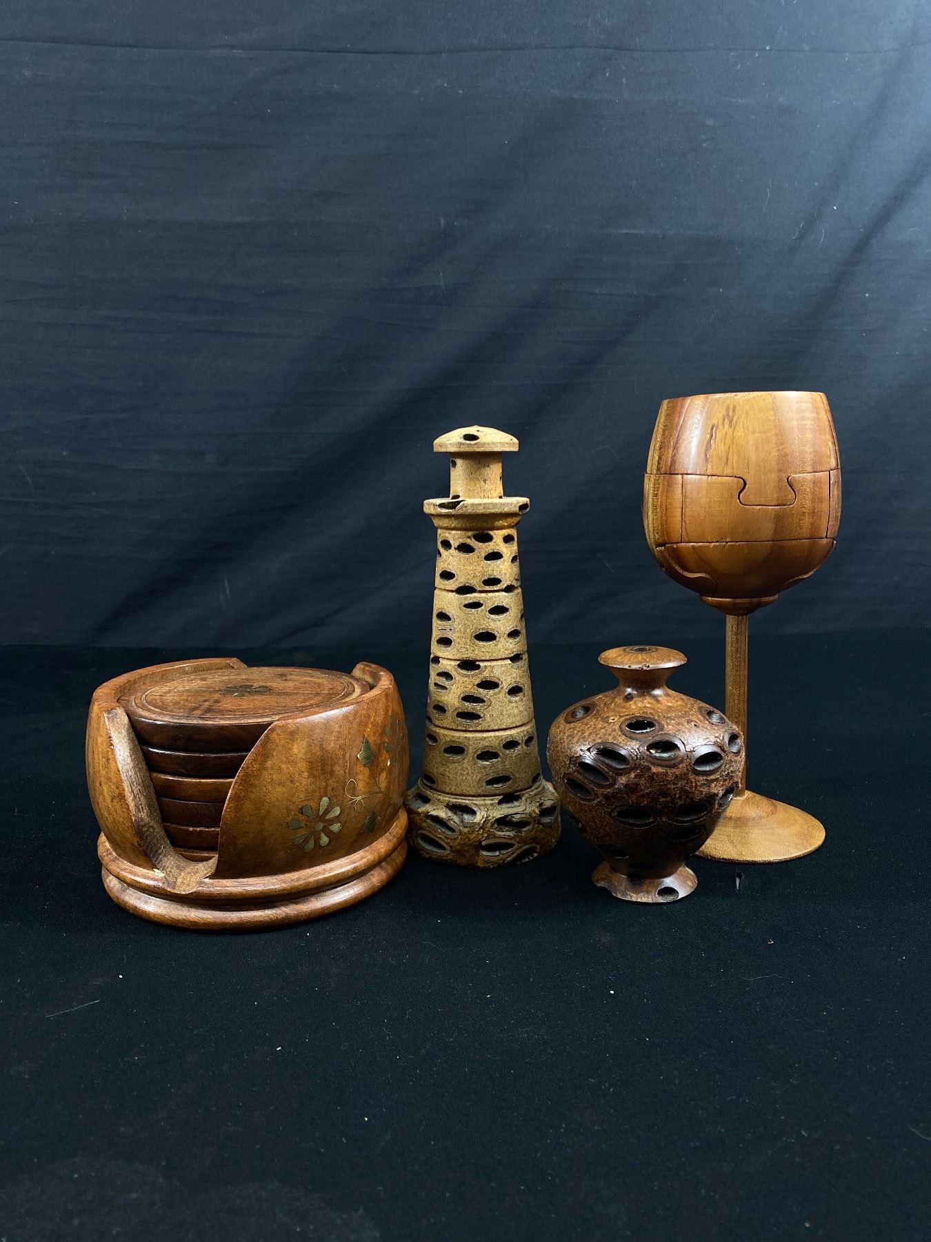 Interesting 4 PC Wood Lot Incl. Puzzle Cup
