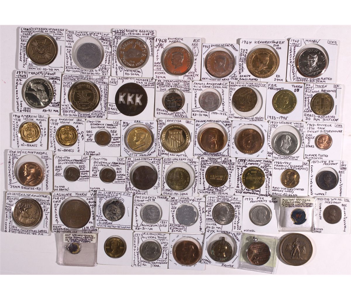Lot of 49 miscellaneous medals from around America, including many presidential medals, a 1930 bronze medallion from the National Society of the Sons of the American Revolution, and a 1999 medal commemorating the original nine Beanie Babies. The KKK, the AAU and AA are also represented. Worthy of inspection. -60891