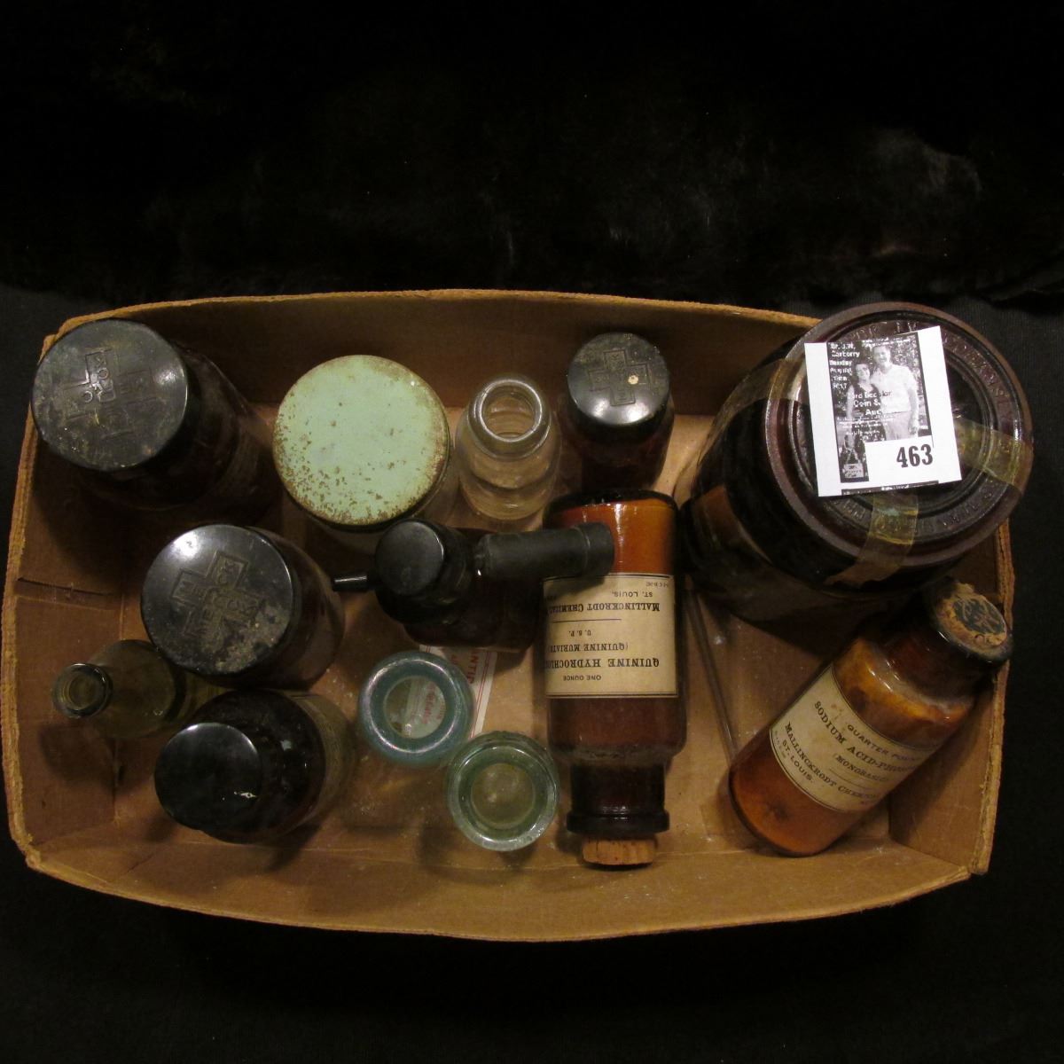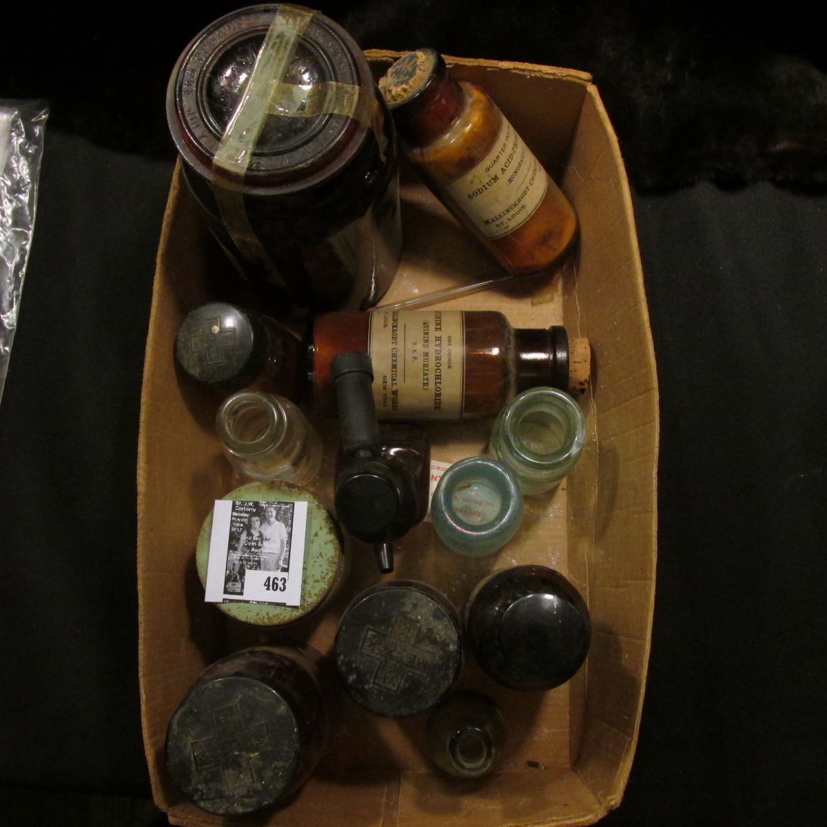 Interesting Box full of Old Medicine Bottles, one amber with a glass lid, several cork stoppered, an