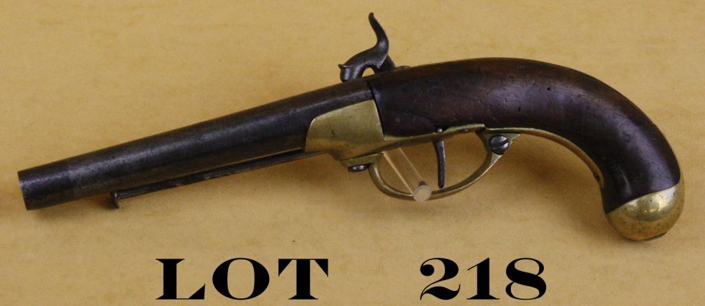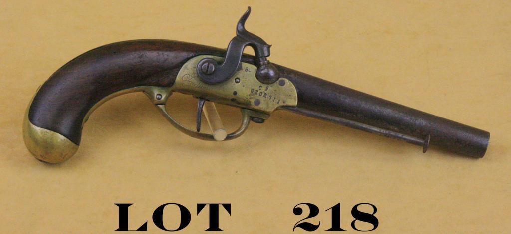 Interesting Charleville flintlock converted to percussion single shot pistol, 7” round barrel, brass frame, trigger guard and butt piece, wood grip, #80. This gun is in overall untouched condition showing a darkpatina on the iron barrel with scattered areas of erosion and surface rust, good action, dark bore, interesting and apparently old conversion to percussion, right side of frame stamped “C S Georgia”; also an “F”stamped on the bottom of the trigger guard and “C S” stamped on the brass butt piece; wood stock is worn with some mars, an old repair and an old loss on the right front side of the grip. Although there is no wayto authenticate the Confederate associated markings, they also do not appear to be patently fake. An interesting piece that is sold “as is” without attribution. Est.: $600-$1,200.