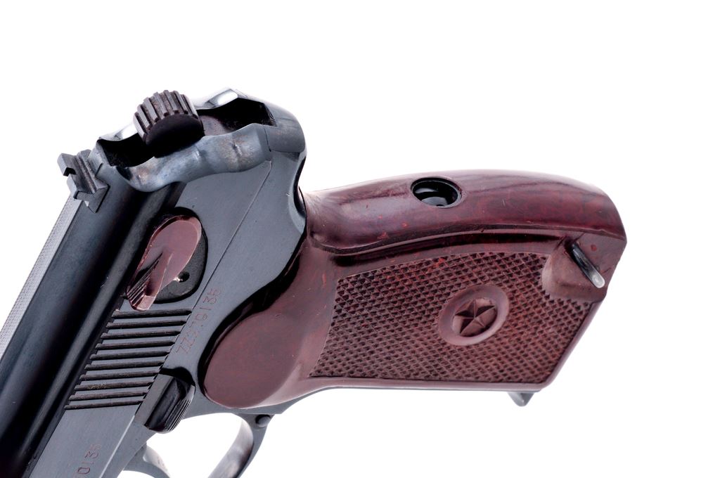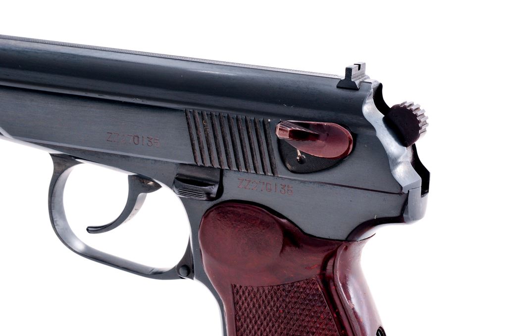Interesting Chinese Type 59 Makarov Semi-Automatic Pistol, with no markings other than the serial number which is #ZZ270135. Pistol is chambered in 9mm Makarov cal., with a polished blue finish, checkered Bakelite grips, standard sights, lanyard bar, and one magazine. Slide and frame with matching numbers. No import marks. Condition is excellent with nearly 100% blue finish remaining, showing a few insignificant handling marks. Grips with some scattered small nicks and scratches to the flat borders; checkering is sharp. Action is smooth and tight and feels like new. Bore is mirror bright. Est.: $400-$600. (Modern/PPT)(Joe Poyer collection)