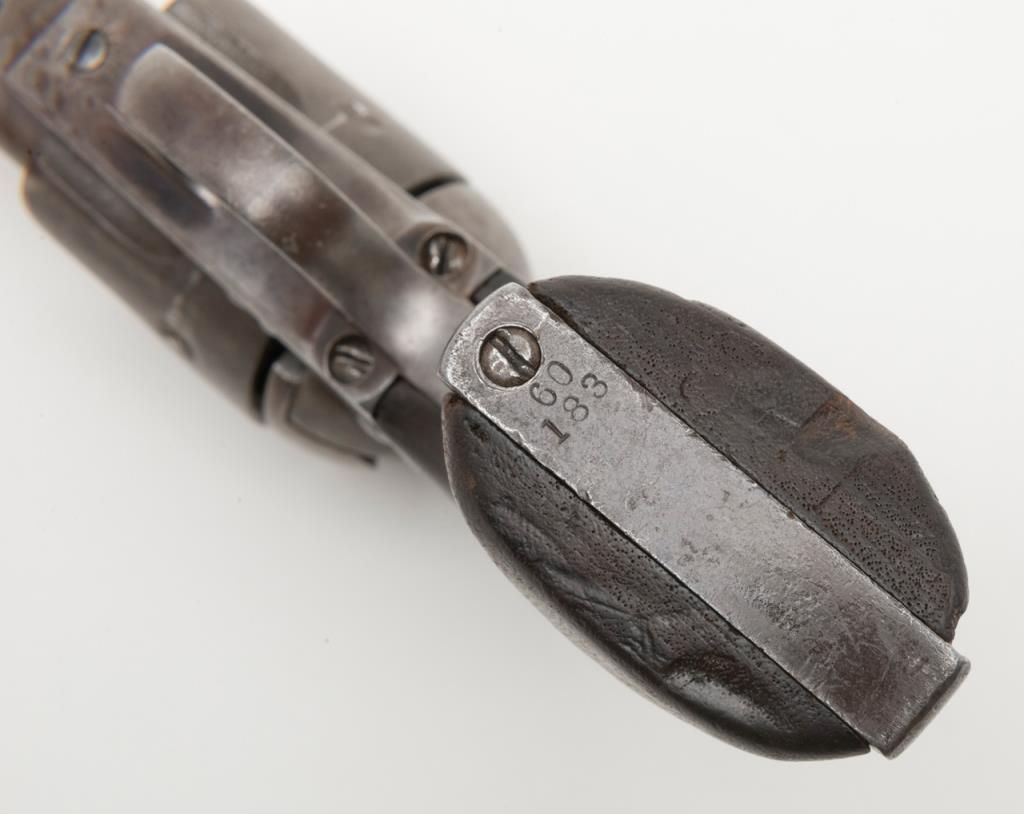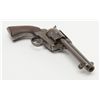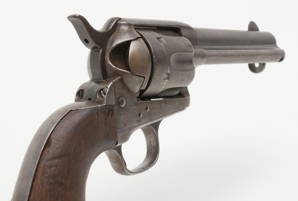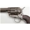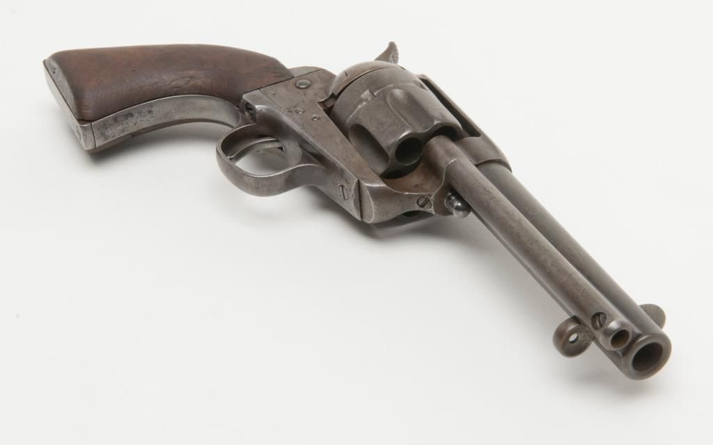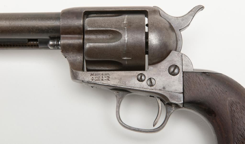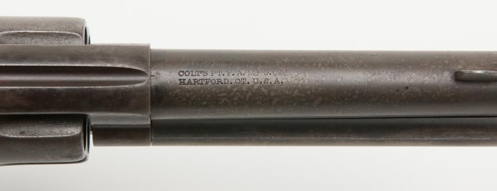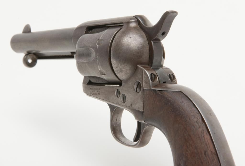 Interesting Colt Civilian Model SAA revolver, .44-40 cal., 4-3/4” barrel with etched panel, blue and case hardened finish, wood grips, #61083 in overall good + condition showing a dark grey patina with scattered pinprick pitting and moremoderate pitting on the cylinder and firing area, partial etched panel scene visible, good bore and action, worn grips with several old large gouges on the left grip; barrel address is rolled backward and the trigger guard and backstrap areerror stamped #60183. From the estate of Joe Kiser. (Antique). Est.: $2,000-$4,000.