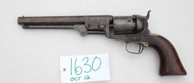 Interesting Colt Model 1851 small guard Navy percussion revolver, .36 cal., 7-1/2” octagon barrel, dark patina, wood grips, #13410. This gun is in overall good condition showing a dark patina on metal surfaces, good action and markings, scattered spots of erosion and pin prick pitting, traces of silver finish on brass straps, matching visible numbers, fair wood grips with scattered old mars and dings; accompanied with an old hand writtenletter dated April 12, 1932 and “Sacramento, California” indicating Colt revolver was found at Springfield Flat in the Bear River Canyon about 4-1/2 miles north of Dutch Flat, Placer Co. which at one time had animmigrant road down this ridge; letter further states the revolver was found in April 1892 under the remains of an old wagon, parts of which were still in evidence with most of the wood burned by forest fires. Theletter further states the gun when found, was rusty and was soaked in coal oil for several months and with sand paper, files and hammer was cleaned and made to work; one loaded chamber had the round drilled out as powder