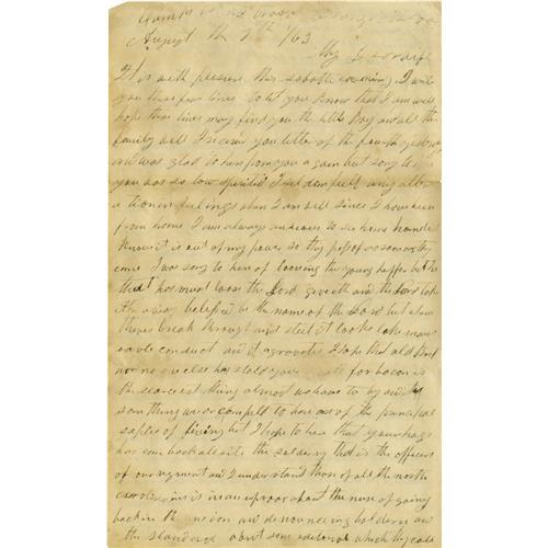 <B>Interesting Content Autograph Letter Signed by Corporal Warrick Hockaday to His Wife,</B></I> August 9, 1863, Camp 1st N.C. Troops Orange Cth (Court House) Va., 5" x 8.25", eight pages. Hockaday offers his wife advice on the maintenance of their home, livestock, and farm. He also writes at length about the conduct of the war, "<I>…our generals ought to stop charging their Union breastworks or going into their country and just defend our own country the best we can and save the lives of our soldiers to defend our homes to the bitter end…</B></I>". He was adamantly opposed to rejoining the Union, "<I>…this idea of ever going back in the union is not worth talking about…we would never command respect again among the combination of states…but be a down trodden people and our children after us.</B></I>" Hockaday tells his wife how he longs to return home to visit. It was an unfulfilled wish. Corporal Hockaday was killed May 8, 1864 at Spotsylvania Courthouse. The letter has some tears along the folds and restoration else near fine.<BR><BR><b>Shipping:</b> Flat Material, Small (<a target="_blank" href="http://www.heritageauctions.com/common/shipping.php">view shipping information</a>)