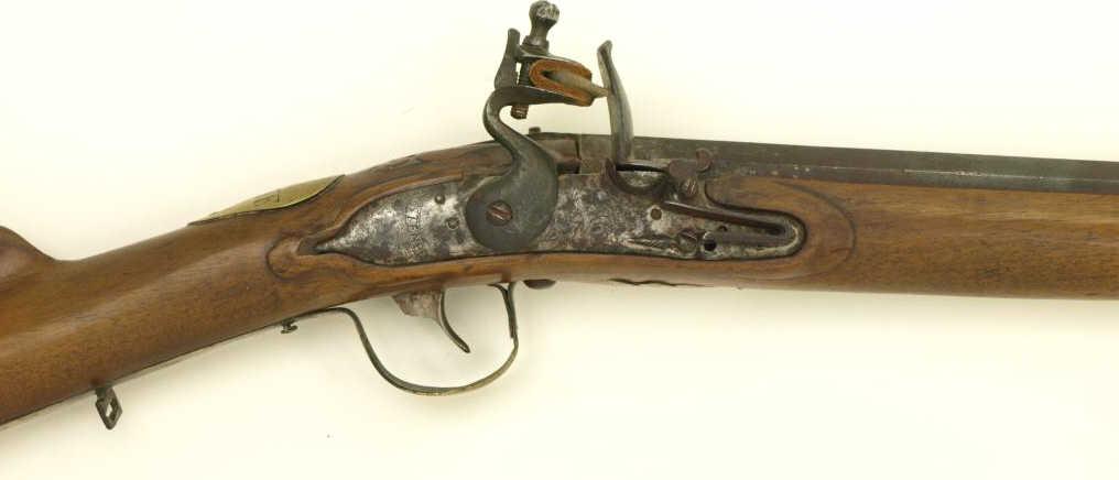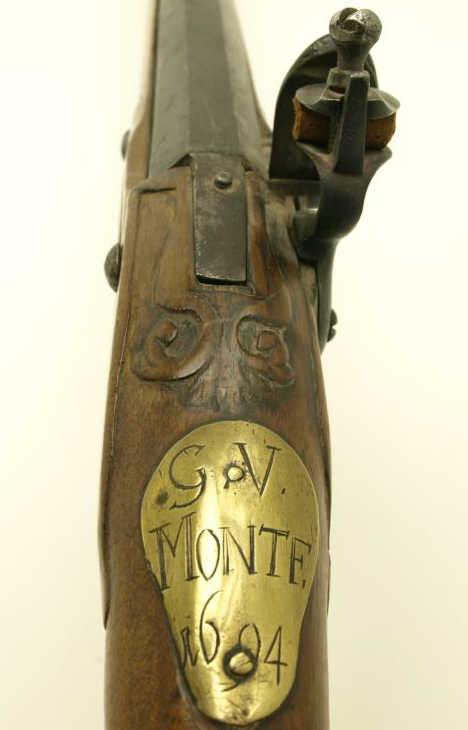 cut down for Naval use, 28" octagon to round barrel, top of stock fitted with brass medallion marked G V Mont F and dated 1694, right side lock with rack number 687, further marked Evrstenberg. Rifle/musket remains very good condition, action functioning, wood good and original brass hardware. NO FFL required.