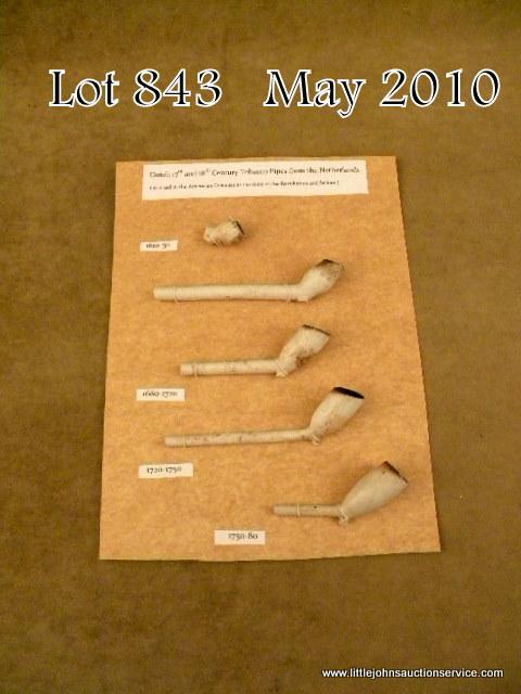 Interesting Dutch clay pipe collection of 5 pipes (some partials) mounted on a cardboard and identified in periods from 1610 thru 1750-1780. Heading on mount states “Dutch 17th and 18th Century Tobacco Pipes from the Netherlands (asused in the American Colonies at the time of the Revolution and before!)”. Est.: $50-$75.