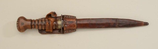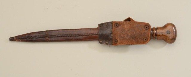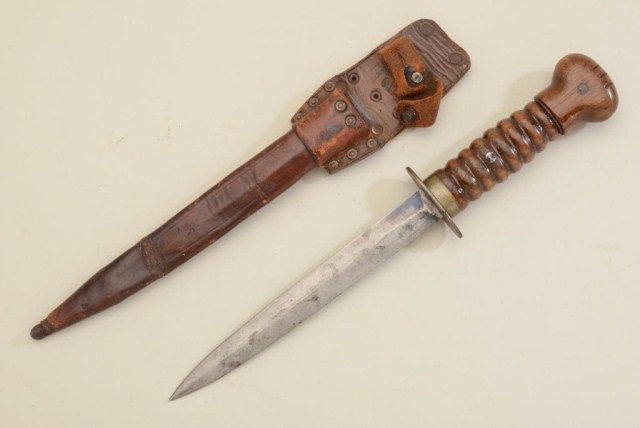 Interesting Dutch trench knife with wood grip and military style leather sheath, circa WWI-WW II era, approx. 13” overall and in good condition with some traces of blue at hilt and crown over Z at hilt, on wood grip and on brass wrap above the plain oval iron guard; sheath is worn with an old repair near the tip and “CW” stamped on the front of the hanger that is marked in pencil “1945”; securing strap damaged; has appearance of acommando knife; bears further research and may be a real sleeper! Est.: $100-$175.