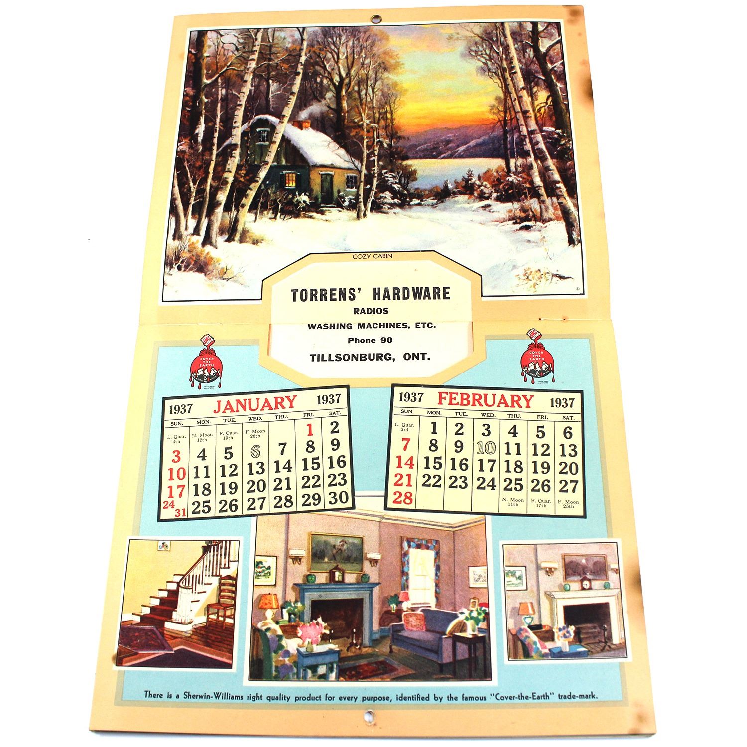 Interesting Find! Vintage 1937 Advertising Calendar for Torrens' Hardware Radios, Washing Machines, etc. in Tillsonburg, ON. Features a Merry Christmas festive cover and each page has two months calendars (some minor staining)