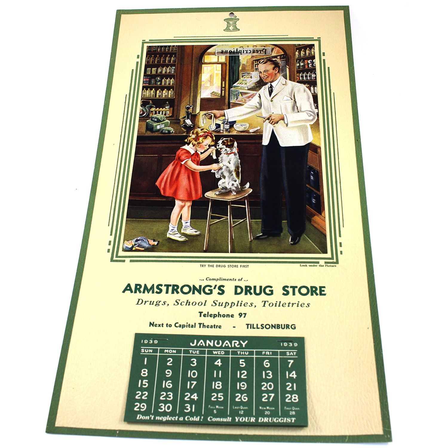 Interesting Find! Vintage 1939 Advertising Calendar for Armstrong's Drug Store in Tillsonburg, ON. This vintage advertising calendar from 1939 has "helpful first aid hints for the home" underneath the picture and features a small calendar at the bottom with a quote on each month's page.