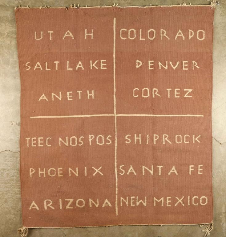 Brown background Navajo rug with big divider woven into it in white "Utah- Salt Lake, Aneth, Colorado-Denver, Cortez, Arizona- Phoenix Tee Nos Pos, New Mexico-Santa Fe, Shiprock. Measures 40"X35" Condition- Overall Good shows some small snags on one end