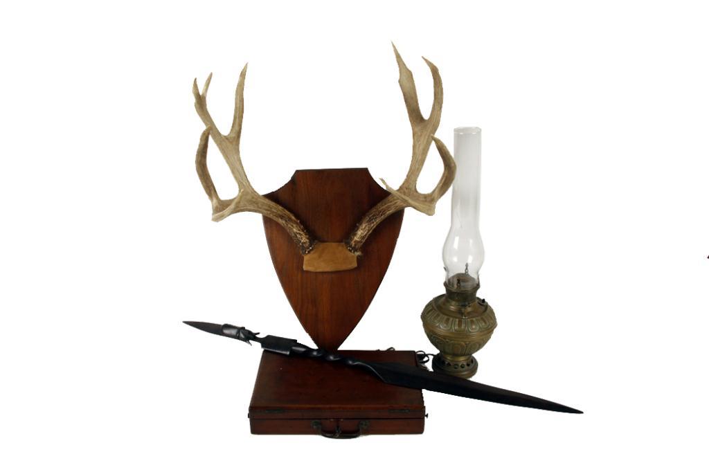Interesting Four Piece Lot A brass table lamp, an African wood carving, an interesting box, and an antler rack with shield back used for displaying a Winchester.A brass table lamp, an African wood carving, an interesting box, and an antler rack with shield back used for displaying a Winchester.
