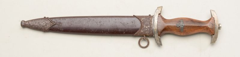 Interesting German SA dagger with sheath in overall fair to good condition showing scattered pitting on the blade and on the sheath; also wear to the wood grip; blade is marked at hilt “Hammesfahr CIE., Solingen”with a swimmer in between the wording; one side of the sheath’s throat is inscribed “Fur unscer brannen Hampten 9-3-36”. If we had to guess, this dagger may have hung in a pool area for some time (maybe as a displaymemento) given the type of old pitting/erosion patterns but only our opinion; the name and date should be researched further as this may have been an award for a soldier/swimmer at the 11thOlympiad in 1936. Est.: $400-$800.