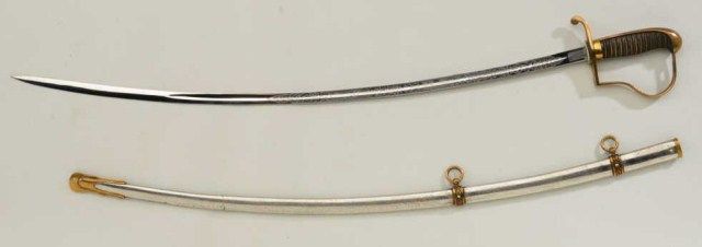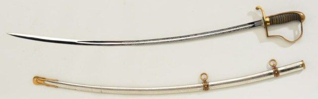 Interesting Imperial-style German sword, made for export to U.S.A. with classic German-style guard but etched with American Eagle, US and agent-marked “Henry V. Allen” with Germany export mark. The condition isvery good + with some slight bubbling to nickel on scabbard; otherwise very good + to near fine; dates about 1900. Est.: $200-$400.