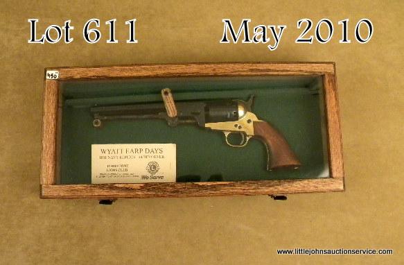 Interesting Italian-made copy of a Colt 1851 percussion revolver, .36 cal., 7-1/2” octagon barrel, blue finish, case hardened loading lever, brass frame and straps, wood grips, #560190. This gun is in overall excellent condition showinglittle handling and is accompanied by a custom wood and glass display piece. It also has raffle tickets from the Tombstone, Arizona Lions Club where it reportedly was won at a past Wyatt Earp Days festival. Est.: $300-$500.