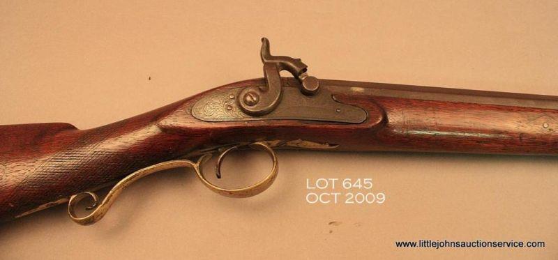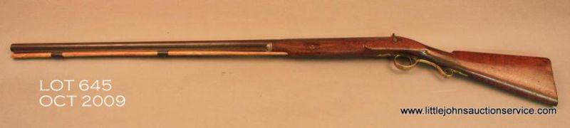 Interesting J. Golcher-marked percussion half-stocked fowler, 12 gauge, 36-1/2” barrel, brown finish, wood stock. This gun is in overall good condition with an even dark brown patina on metal surfaces, good action and overall good woodstock with usual nicks, mars and scratches from carry and storage. Est.: $150-$300.