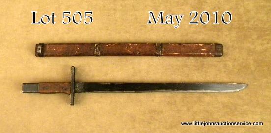 Interesting Korean-made for Japanese “pole” bayonet with a bamboo sheath for the Japanese Arisaka military rifle, approx. 20” overall with a 15-1/2” blued steel blade in overall very good condition showing a Jinsen Arsenal mark on thehilt of the bayonet; wood grip with two iron rivets; iron pommel with button lock for hooking into the rifle’s lug; the sheath is also in overall good condition with metal end pieces and two twine wraps. Est.: $200-$500.