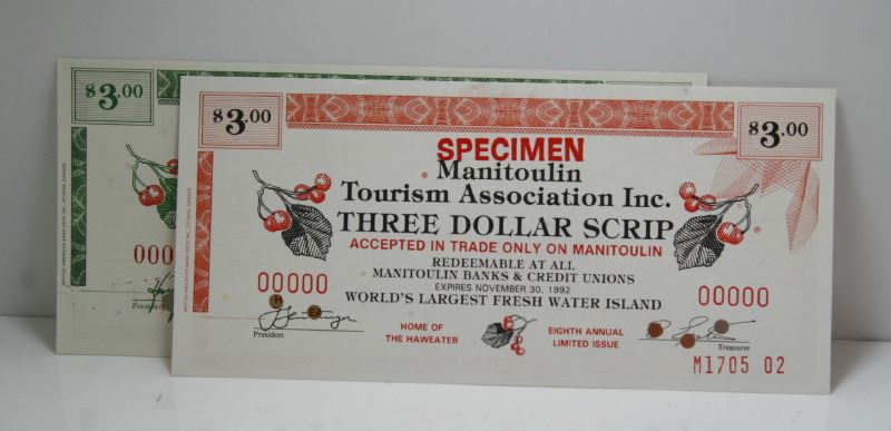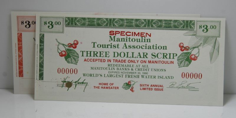 Very Cool Canadian Varient Lot -- 2000 (W) Uncircualted Coin Set (Rare Winnipeg Mint Edition), 1967 Wellings Mint Medallion, 2 manitoulin Tourism Association Specimen Notes