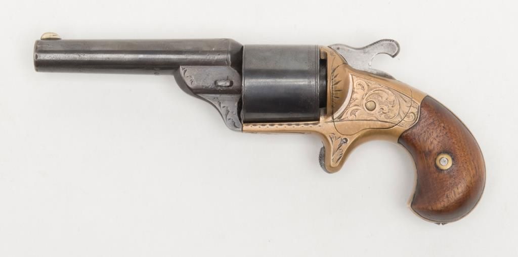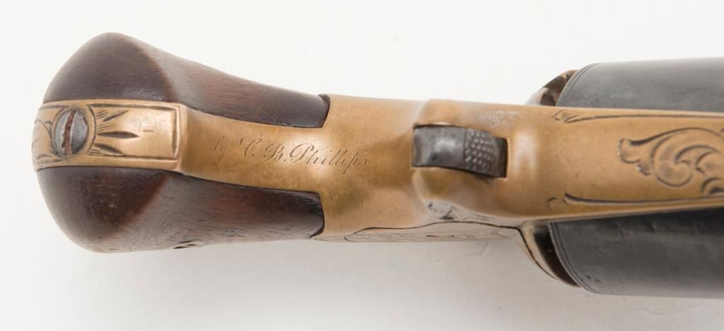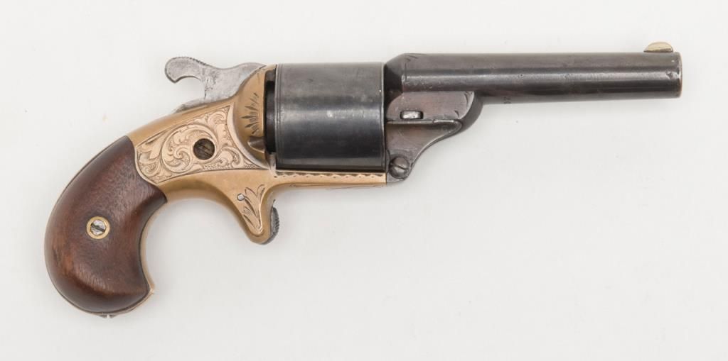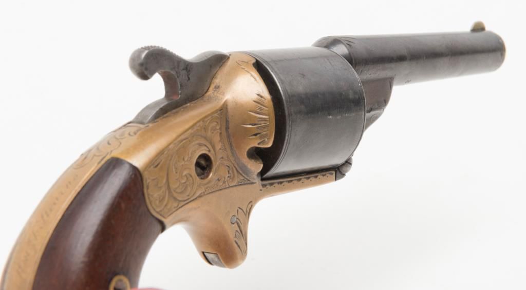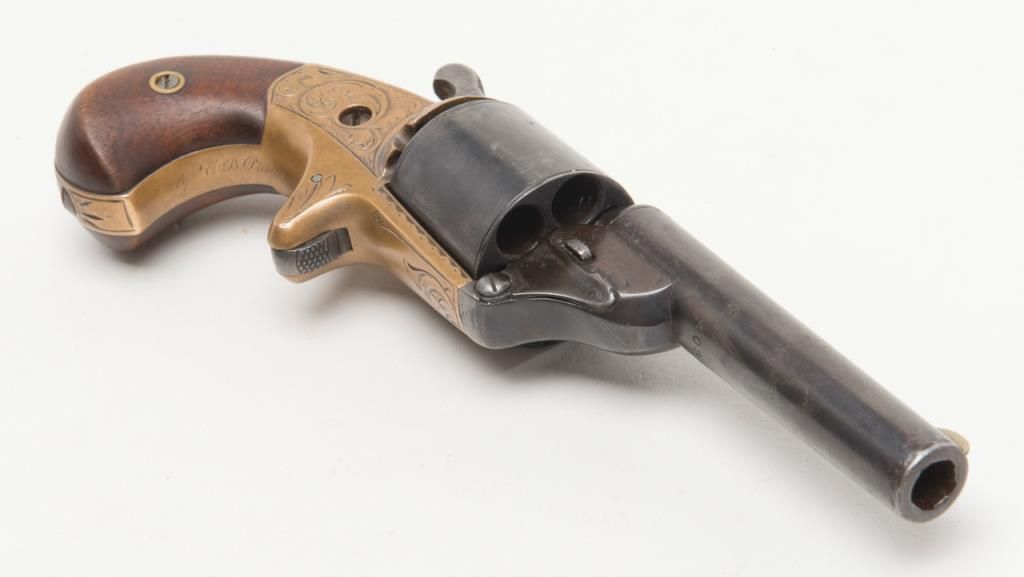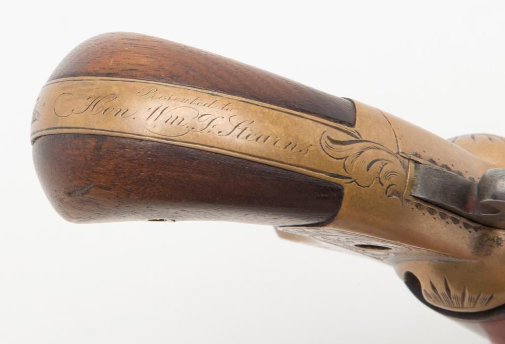 Interesting Moore Teat Fire 6-shot revolver, period script inscribed “presented to Hon. Wm. F. Stearns” on backstrap and “by C B Phillips” on the inside of the frame at gripping area. The barrel and cylinder show an old re-blue finish, theframe was lightly cleaned long ago, the grips are good, the gun is numbered G06. A documenting letter from noted author and firearms expert, Lee Silva, is included, which in summary states William French Stearns owned a prosperousmercantile store in Bombay, India during the 1850’s and ‘60’s where he met Dr. David Livingstone. When the Doctor “disappeared”, and Stanley found him, uttering the now famous words: “Dr. Livingstone, I presume?” many felt at thetime, that Stanley had not found Livingstone but Stearns was a key witness who identified Livingstone’s writings which were finally accepted as genuine, mainly due to Stearns. Included in the file with this historic piece are additionalmaterials on the Stearns family, including information on Stearns’ father who was President of Amherst College in Massachusetts and at the outbreak of the Civil War, raised a unit in support of the Union. Stearns, Sr. would later be