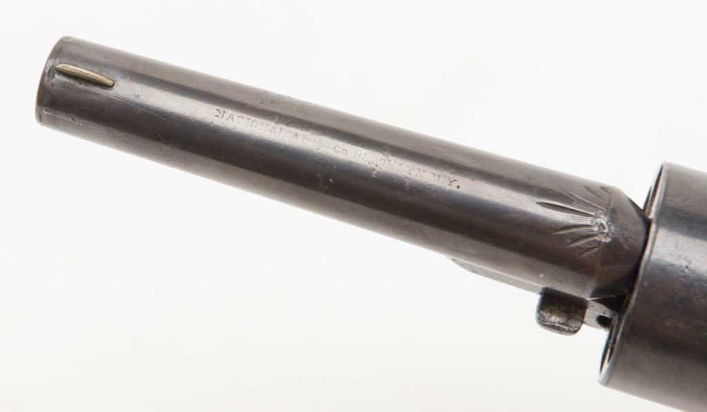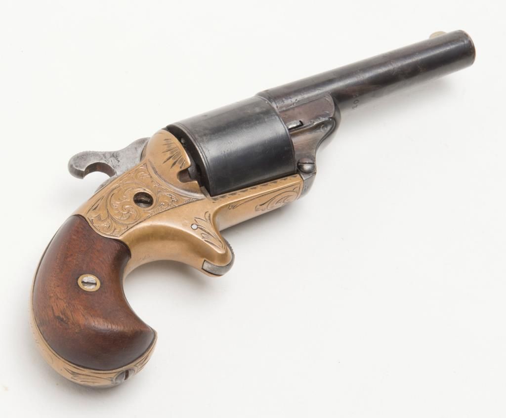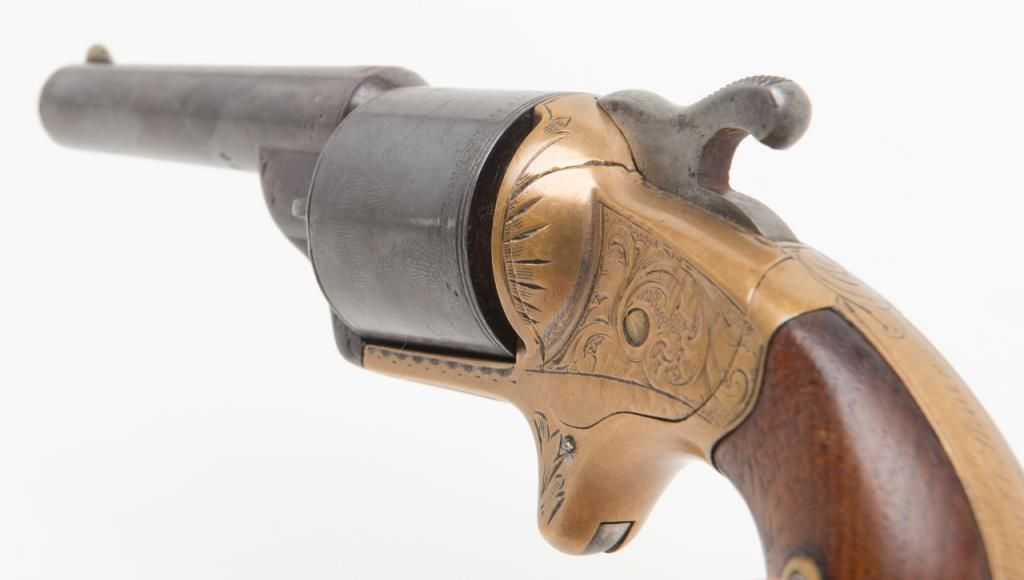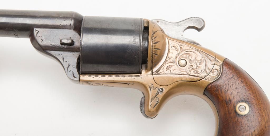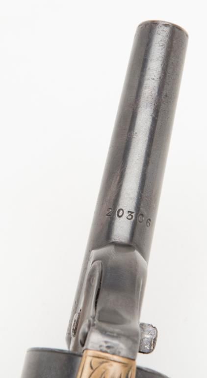 Interesting Moore Teat Fire 6-shot revolver, period script inscribed “presented to Hon. Wm. F. Stearns” on backstrap and “by C B Phillips” on the inside of the frame at gripping area. The barrel and cylinder show an old re-blue finish, theframe was lightly cleaned long ago, the grips are good, the gun is numbered G06. A documenting letter from noted author and firearms expert, Lee Silva, is included, which in summary states William French Stearns owned a prosperousmercantile store in Bombay, India during the 1850’s and ‘60’s where he met Dr. David Livingstone. When the Doctor “disappeared”, and Stanley found him, uttering the now famous words: “Dr. Livingstone, I presume?” many felt at thetime, that Stanley had not found Livingstone but Stearns was a key witness who identified Livingstone’s writings which were finally accepted as genuine, mainly due to Stearns. Included in the file with this historic piece are additionalmaterials on the Stearns family, including information on Stearns’ father who was President of Amherst College in Massachusetts and at the outbreak of the Civil War, raised a unit in support of the Union. Stearns, Sr. would later be