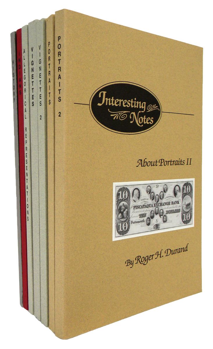 Durand, Roger H. INTERESTING NOTES ABOUT HISTORY. (Rehoboth), 1990. 8vo, original printed card covers; mounted illustration. (4), 170, (2) pages; illustrated. Inscribed by the author to John J. Ford, Jr. Fine. [with] Durand, Roger H. INTERESTING NOTES ABOUT INDIANS. Rehoboth, 1991. 8vo, original printed card covers; mounted illustration. (4), 135, (3) pages; illustrated. Inscribed by the author to John J. Ford, Jr. Fine. [with] Durand, Roger H. INTERESTING NOTES ABOUT ALLEGORICAL REPRESENTATIONS. Rehoboth, 1994. 8vo, original printed card covers; mounted illustration. (3), 106, (3) pages; illustrated. Inscribed by the author to John J. Ford, Jr. Fine. [with] Durand, Roger H. INTERESTING NOTES ABOUT VIGNETTES. Rehoboth, 1995. 8vo, original printed card covers; mounted illustration. (4), 131, (3) pages; illustrated. Inscribed by the author to John J. Ford, Jr. Fine. [with] Durand, Roger H. INTERESTING NOTES ABOUT VIGNETTES II. Rehoboth, 1996. 8vo, original printed card covers; mounted illustration. (4), 130, (2) pages; illustrated. Signed by the author. Fine. [with] Durand, Roger H. INTERESTING NOTES ABOUT PORTRAITS. Rehoboth, 1996. 8vo, original printed card covers; mounted illustration. (4), 151, (3) pages; illustrated. Inscribed by the author to John J. Ford, Jr. Fine. [with] Durand, Roger H. INTERESTING NOTES ABOUT PORTRAITS II. Rehoboth, 1997. 8vo, original printed card covers; mounted illustration. (4), 146, (2) pages; illustrated. Errata sheet and flyer concerning future volumes laid in. Inscribed by the author to John J. Ford, Jr. Fine. Seven of Durand’s books examining different facets of U.S. paper money. Quite interesting, indeed.