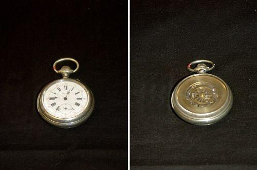 Intéressante montre de poche en nickel double face, cadran en émail blanc avec chiffres romains en noir pour les heures et chiffres arabes en rouge pour les minutes, aiguilles en acier bleui fleur de lys, signée DEPOSE, 1900