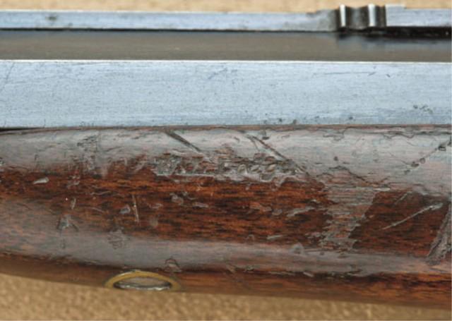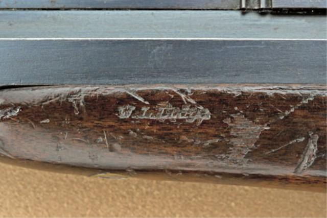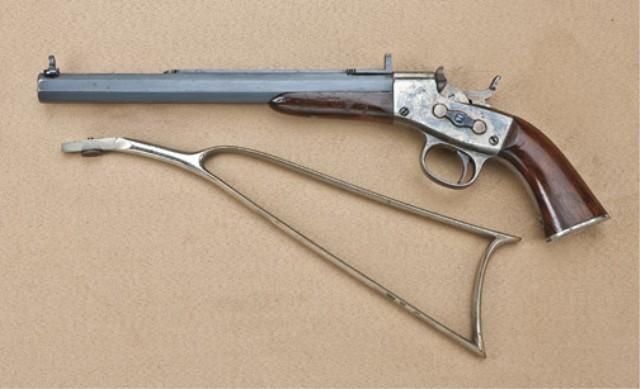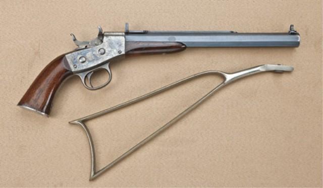 Interesting Remington Rolling Block custom pistol with wire frame shoulder stock, .32 caliber rimfire, blue and case hardened finish, wood stocks, forend period stamped in fancy script letters “W. L. Dodge”, who was a factory employee. The pistol shows a finely made target type rear sight which is 6-1/4” in length and a folding type breech front sight. The pistol shows a octagon barrel of medium to heavy weight and retains 95% original blue. 75-85% original case hardening on the action. Grips show 50-60% varnish with some even edgewear and small losses. The stock is numbered to match and fits into a groove which is milled into a plate which is affixed by four screws to the butt. The forend shows some scratches, mars, some even loss of finish. The nickel plated butt and buttstock show 75% nickel over brass. The action is good, bore is very good plus. The action and pistol shows no markings and could possibly have been an experimental or personal project accomplished by Dodge who was well known in shooting circles. From Jerry Landskron collection. Est: $1,500 - $3,000