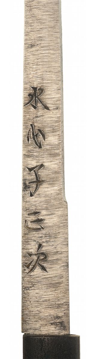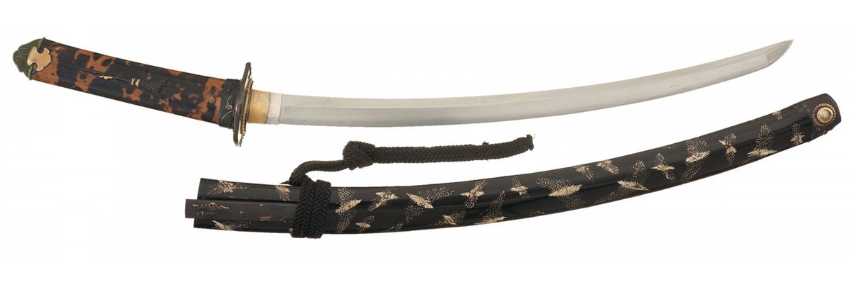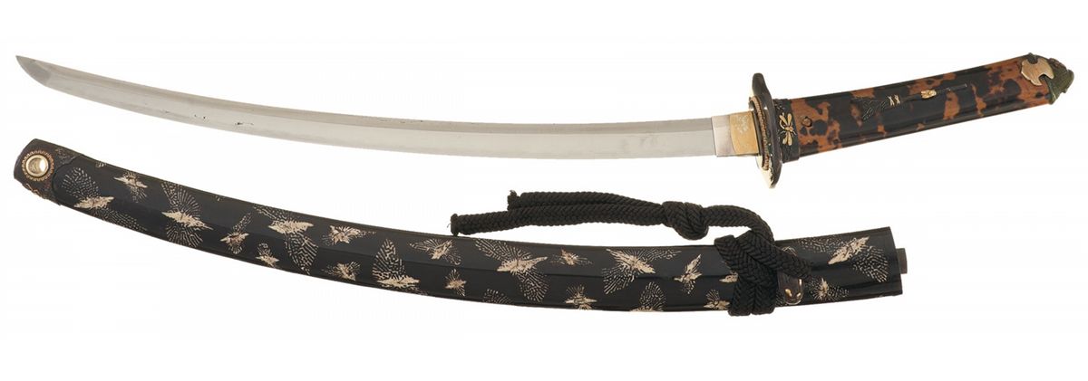 Measuring 22 inches overall, with a 14 3/4 inch blade, slightly wavy temper line, and a silver collar with gilt reinforcement panels. Moko pattern tsuba, with raised floral and insect designs made from gold and green stone. A two figure signature, "Kanenori", is present. The hilt is adorned with a turtle shell veneer, with gilt insects on the fuchi, gold accented broomstick and fly menuki, and a pair of serrated gold panels securing the kashira, which is decorated with a bronze bodied, golden eyed frog perched on a green leaf. With a dark brown lacquered scabbard, adorned with white moths, gold accented insect themed fittings, a black suspension cord and a kogatana with 5 symbol signature on the blade and a scene of birds in flight over a body of water on the grip.
