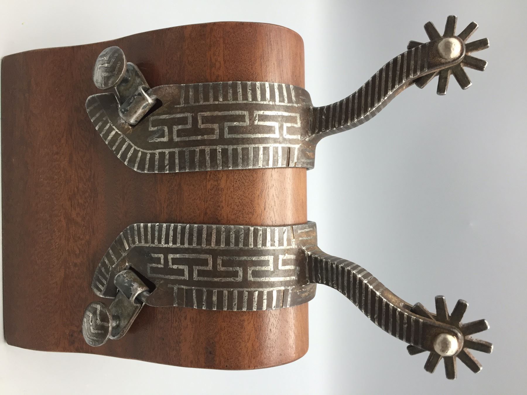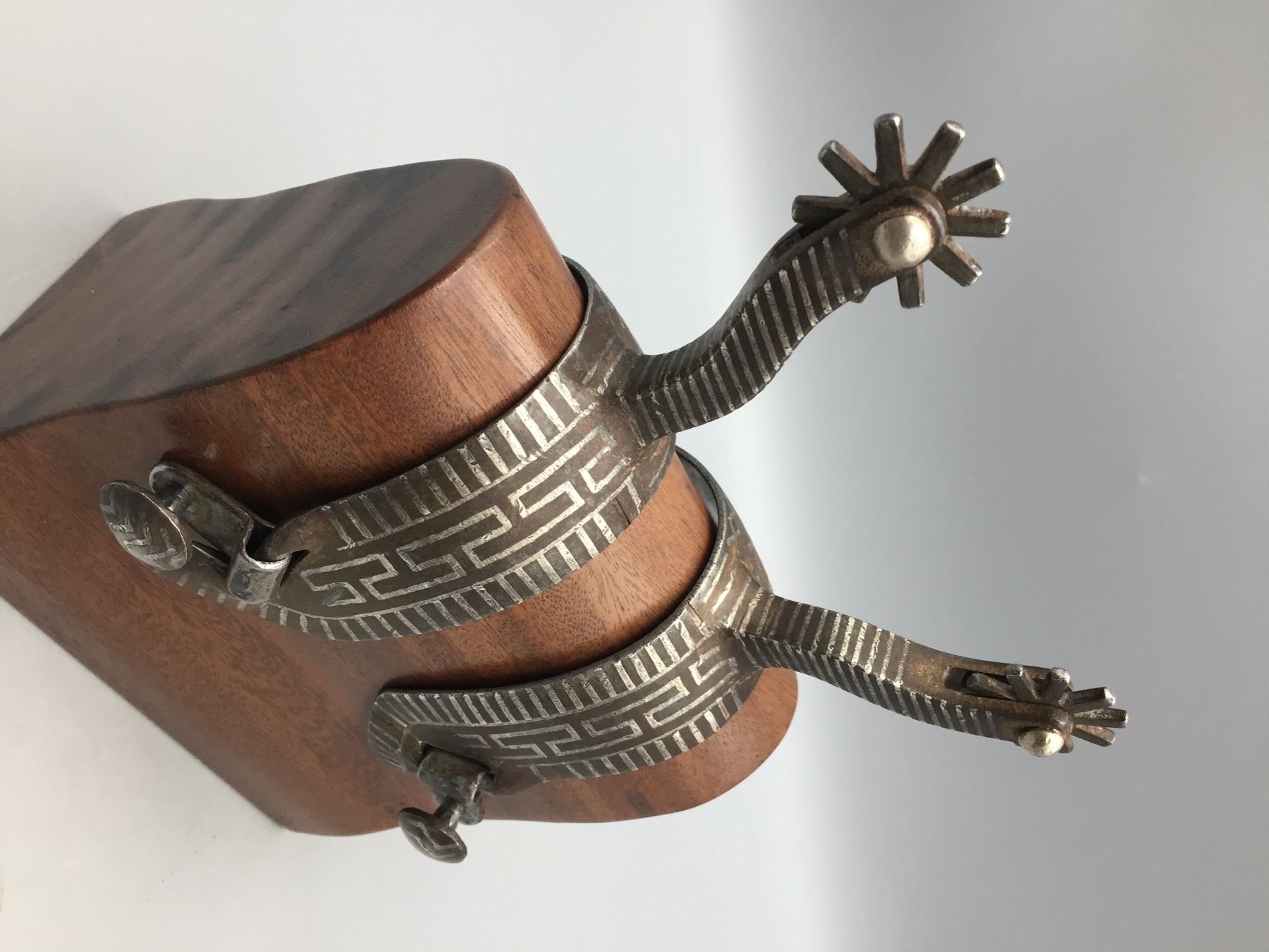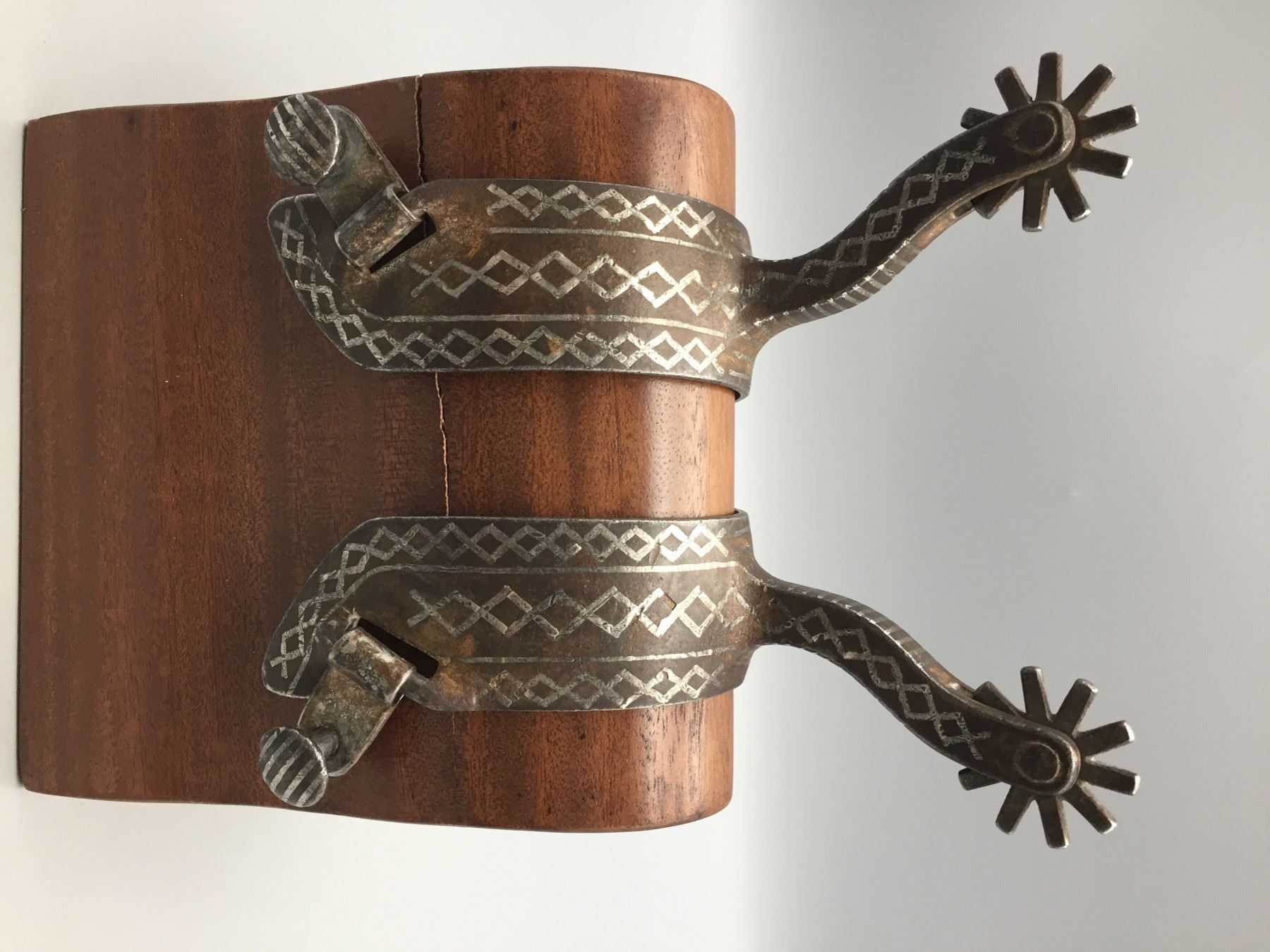 Description: For your consideration we offer for sale this nice pair of silver inlay spurs. The silver inlay designs are quite possibly by Felix Guitron. They are not marked except the number 15 is on the inside of the heel band on one of them. Maker: Possibly Felix Guitron? Approx. Age: Vintage. Size: 3-1/4†heel, 3†shank, including rowel. Condition: Good for its age, normal wear expected. Please look closely at the pictures - they are an important part of our description. Shipping: There will be a $5 handling / packaging fee for shipping this lot. The actual cost of postage will be added on top of that.