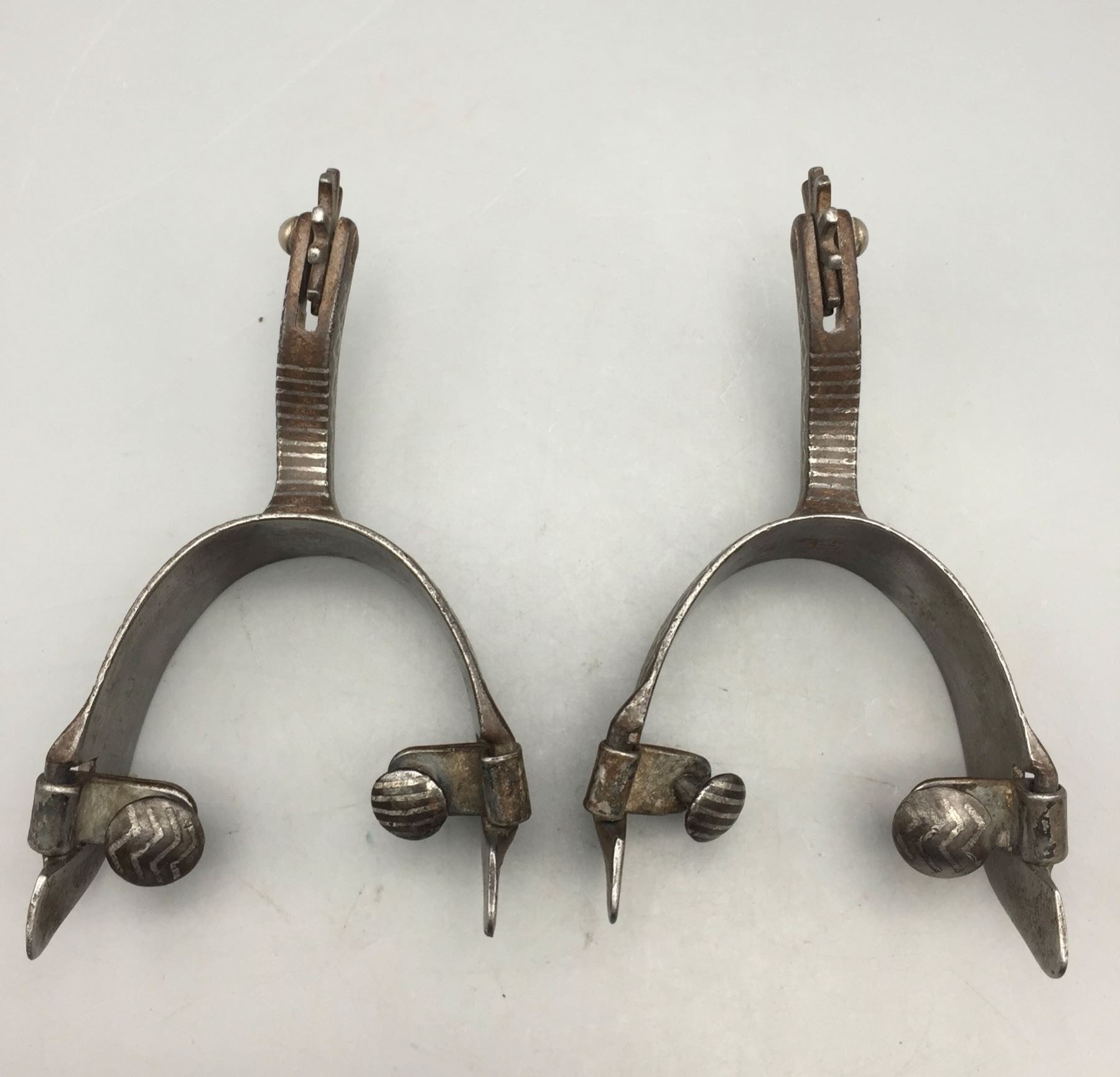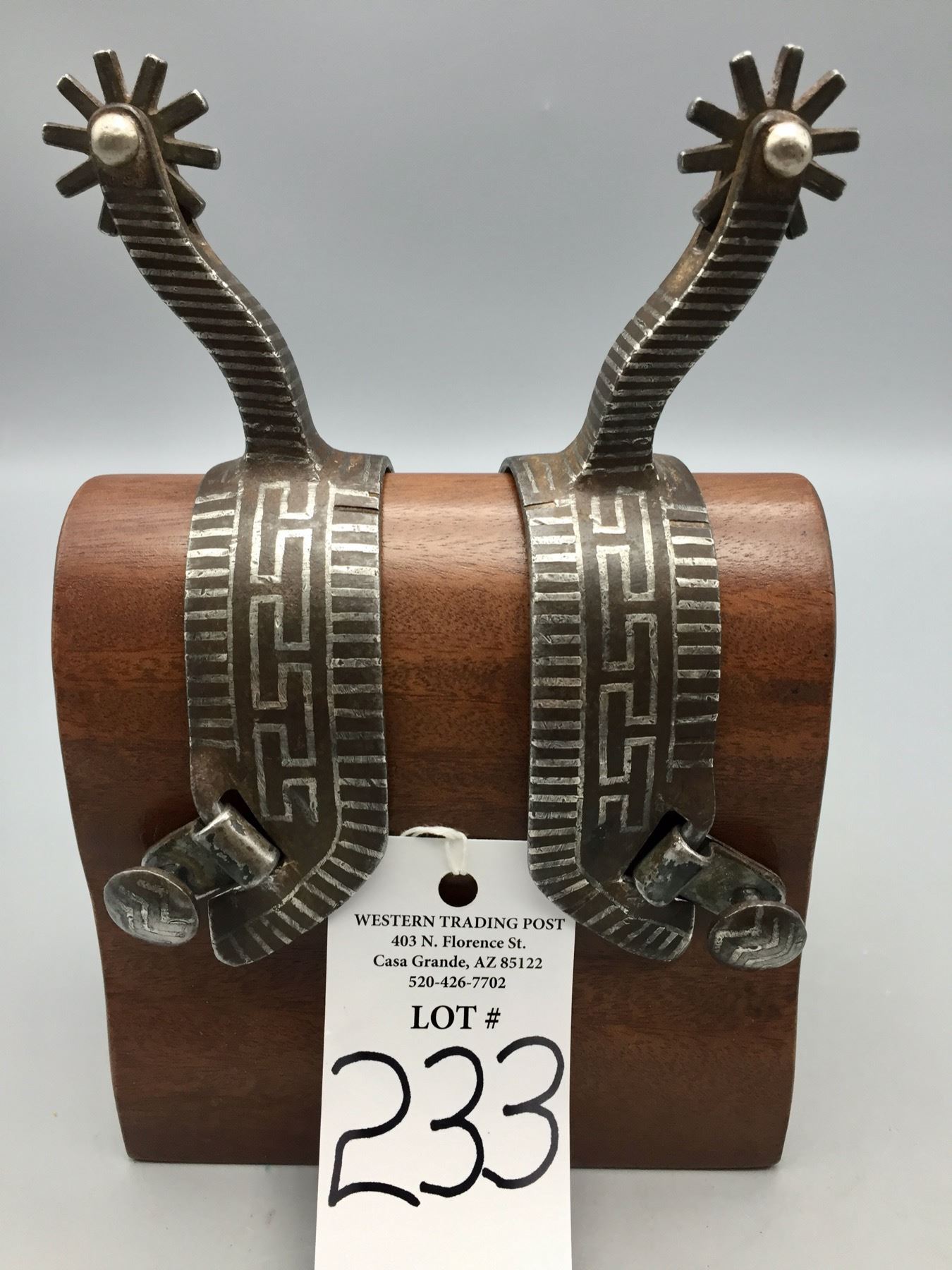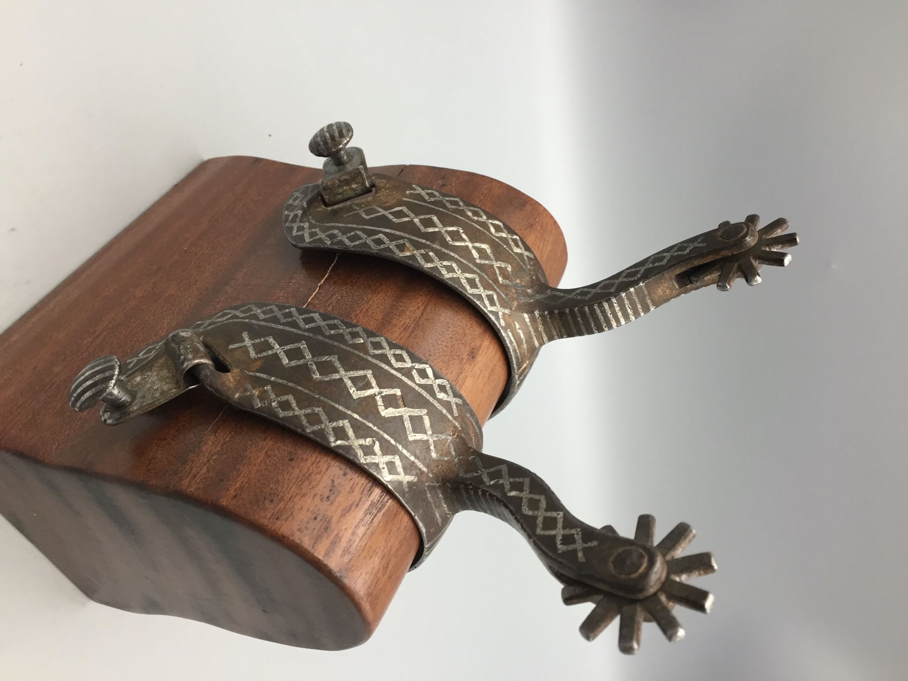 Description: For your consideration we offer for sale this nice pair of silver inlay spurs. The silver inlay designs are quite possibly by Felix Guitron. They are not marked except the number 15 is on the inside of the heel band on one of them. Maker: Possibly Felix Guitron? Approx. Age: Vintage. Size: 3-1/4†heel, 3†shank, including rowel. Condition: Good for its age, normal wear expected. Please look closely at the pictures - they are an important part of our description. Shipping: There will be a $5 handling / packaging fee for shipping this lot. The actual cost of postage will be added on top of that.