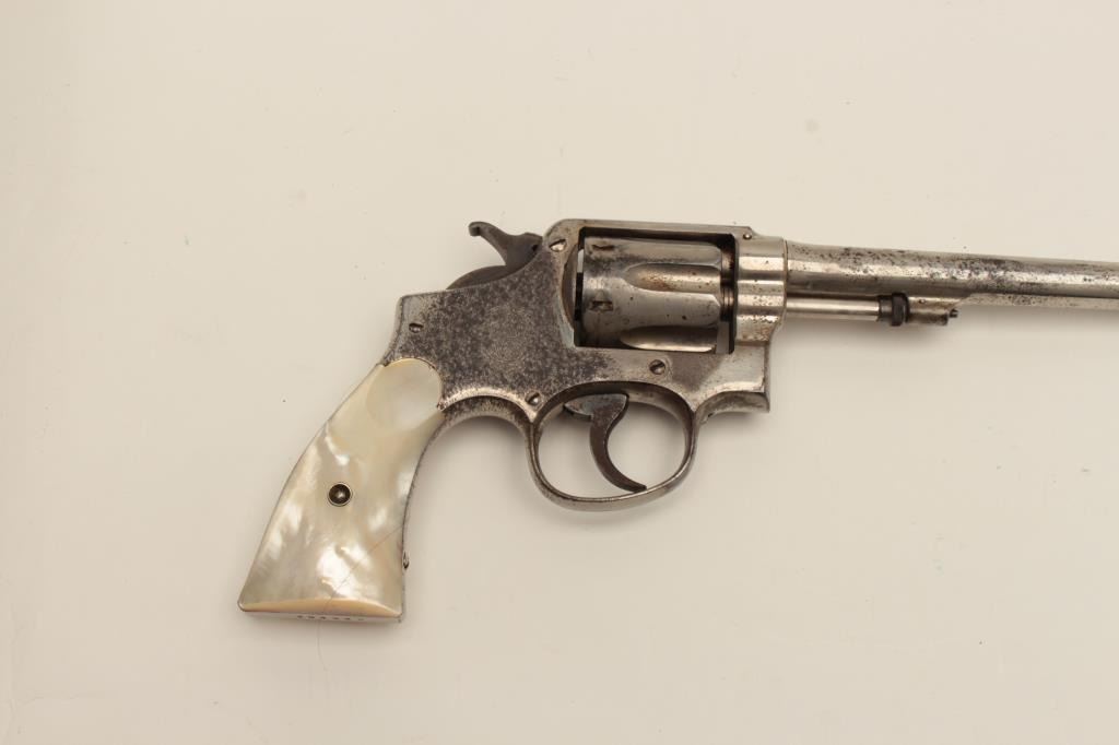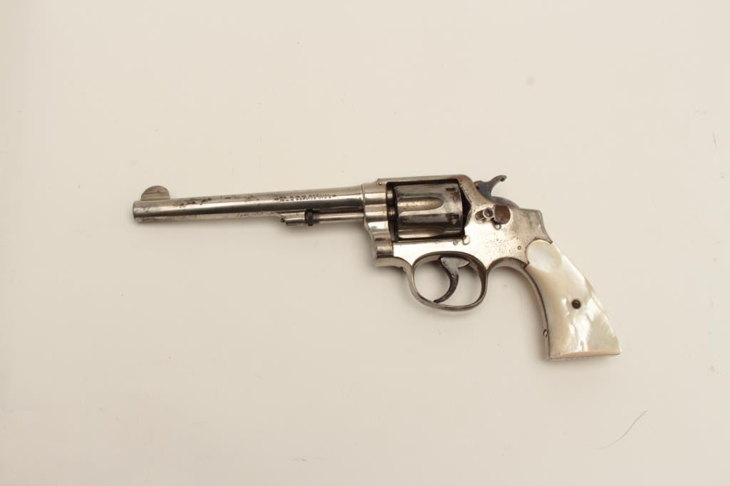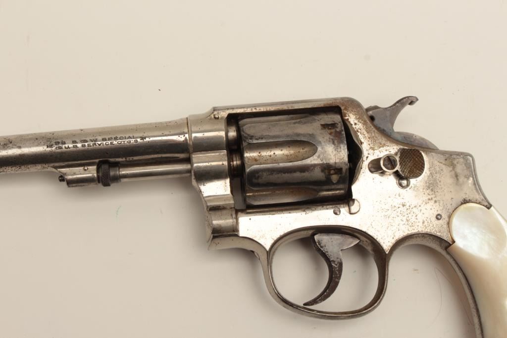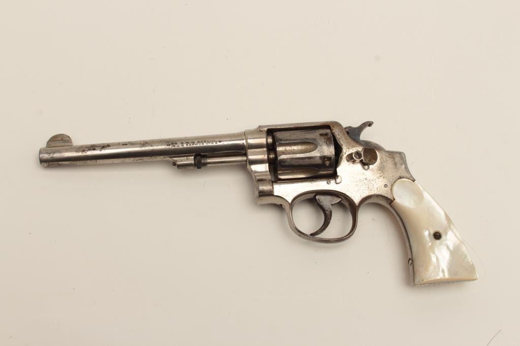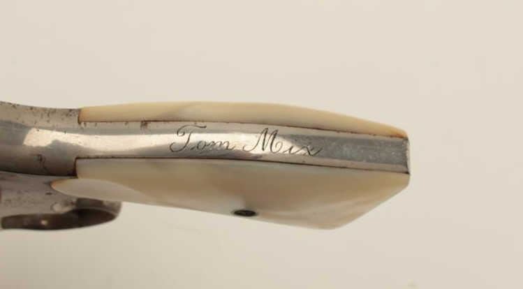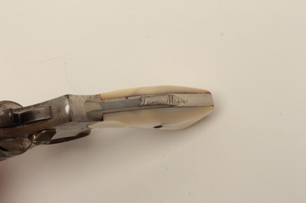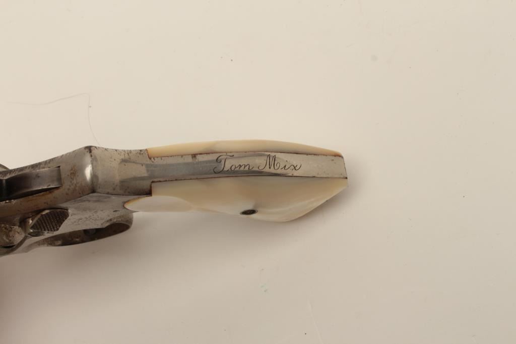 Interesting Smith & Wesson DA revolver, 5-screw frame, .38 S&W Special caliber, 6.5” barrel, nickel finish, pearl grips, S/N 107548, with inscription on back strap “Tom Mix”. This revolver shows approximately 50%original nickel finish, with very good bore, crisp action, good markings and beautiful iridescent pearl grips. By consignor’s family tradition, this gun belonged to the famous cowboy and early movie actor Tom Mix. Further research including a request to Smith & Wesson for a factory letter could provide additional information on this revolver. (C&R/No PPT). Est.: $2,000-$4,000.