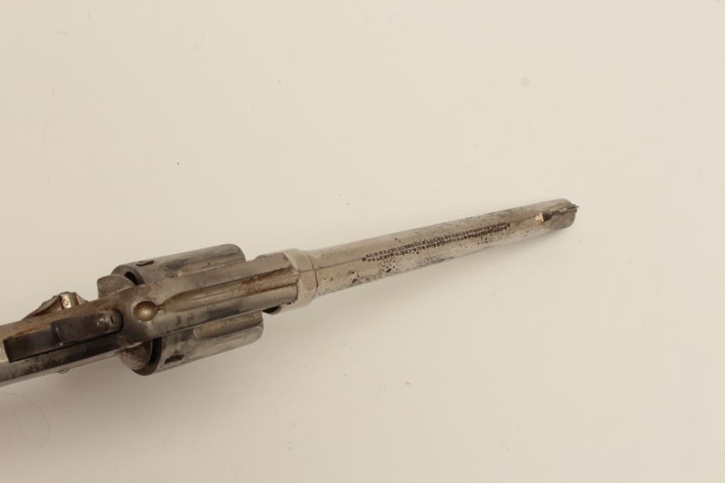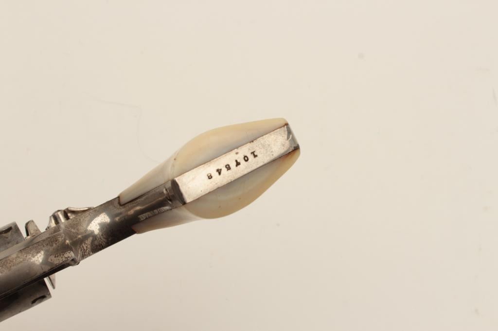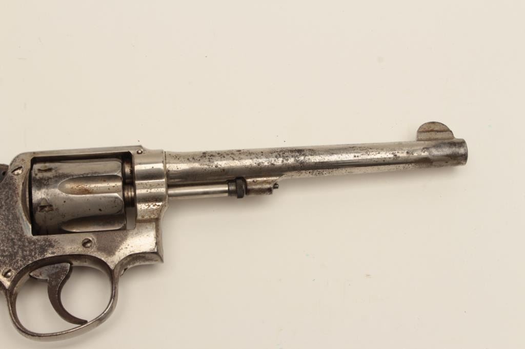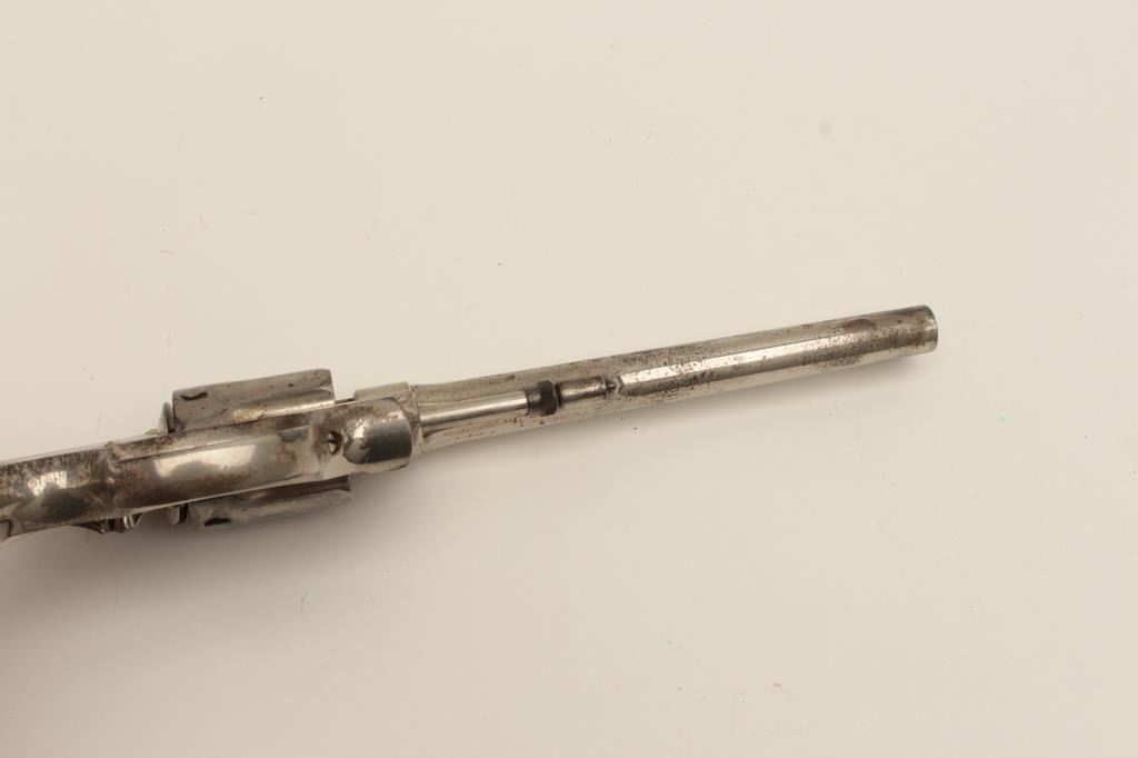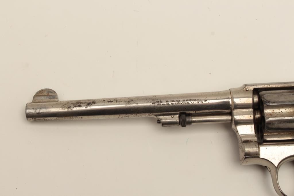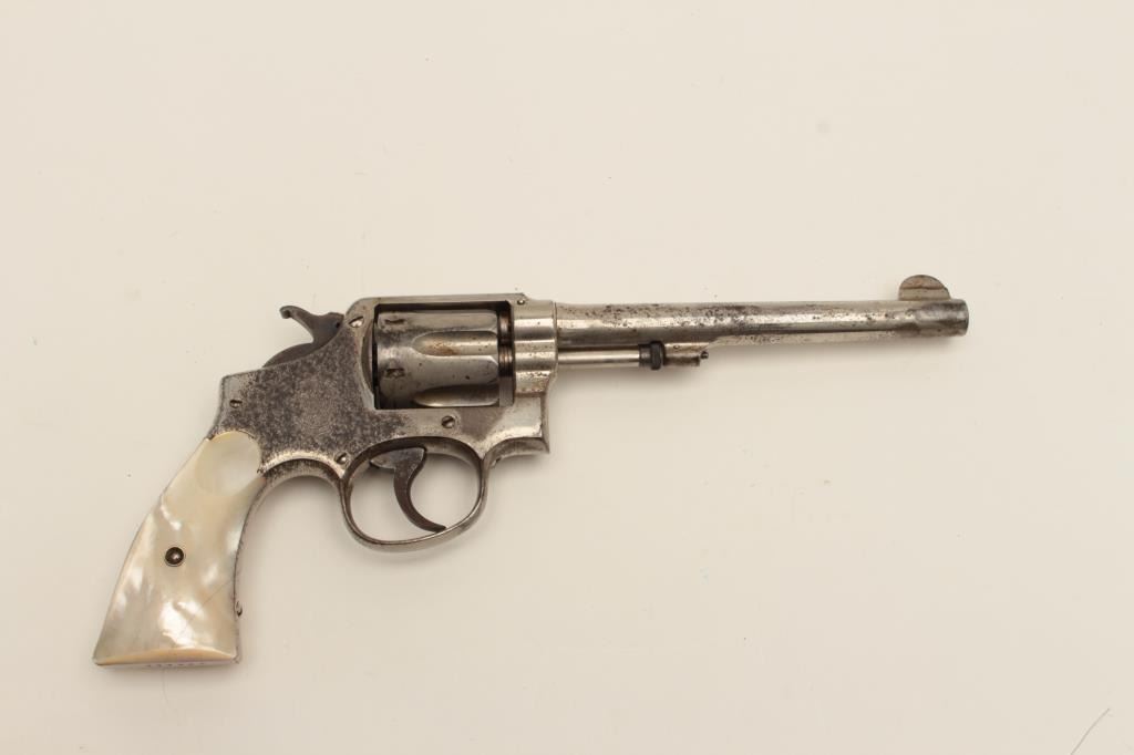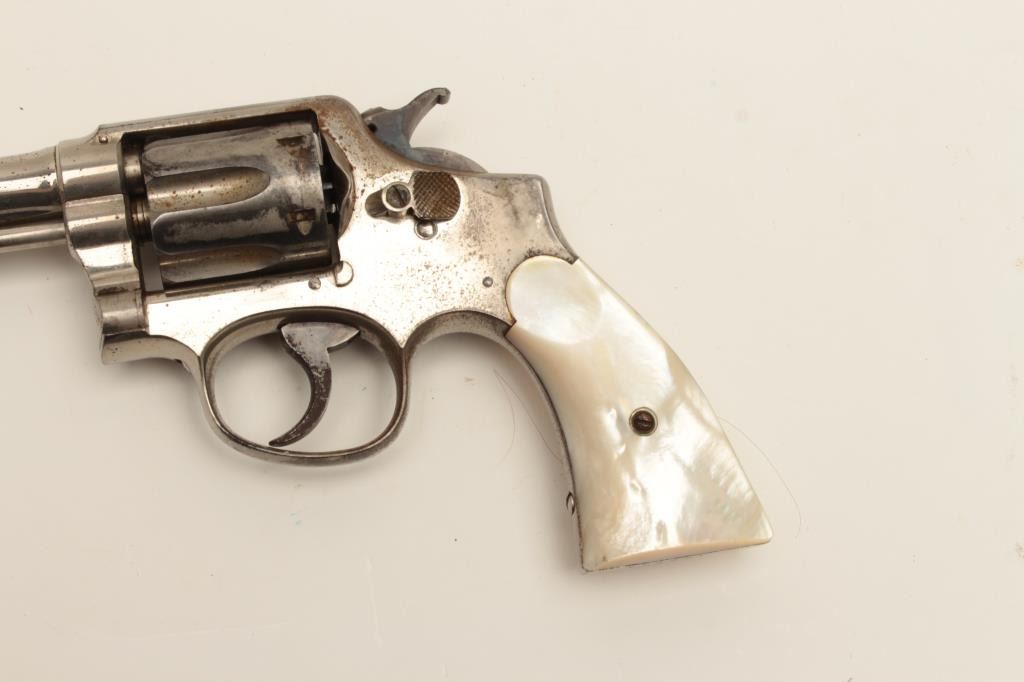 Interesting Smith & Wesson DA revolver, 5-screw frame, .38 S&W Special caliber, 6.5” barrel, nickel finish, pearl grips, S/N 107548, with inscription on back strap “Tom Mix”. This revolver shows approximately 50%original nickel finish, with very good bore, crisp action, good markings and beautiful iridescent pearl grips. By consignor’s family tradition, this gun belonged to the famous cowboy and early movie actor Tom Mix. Further research including a request to Smith & Wesson for a factory letter could provide additional information on this revolver. (C&R/No PPT). Est.: $2,000-$4,000.