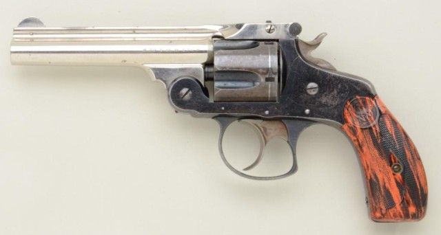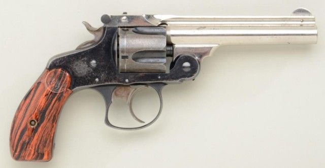 Interesting Smith & Wesson top break DA revolver, .38 S&W cal., 4” barrel, blue finish to frame and cylinder, nickel finish to barrel assembly, factory mottled hard rubber grips, #416820. This gun is in overall very good to fine condition showing considerable original blue on the frame, blue in the flutes of the cylinder with balance gone to a brown patina; majority of the nickel finish remains on the barrel assemblyand appears original; all matching visible serial numbers including the barrel assembly; should be factory lettered given what appears to be special features of grips and two-tone finish. From the Dr. John HallCollection. Est.: $350-$700.