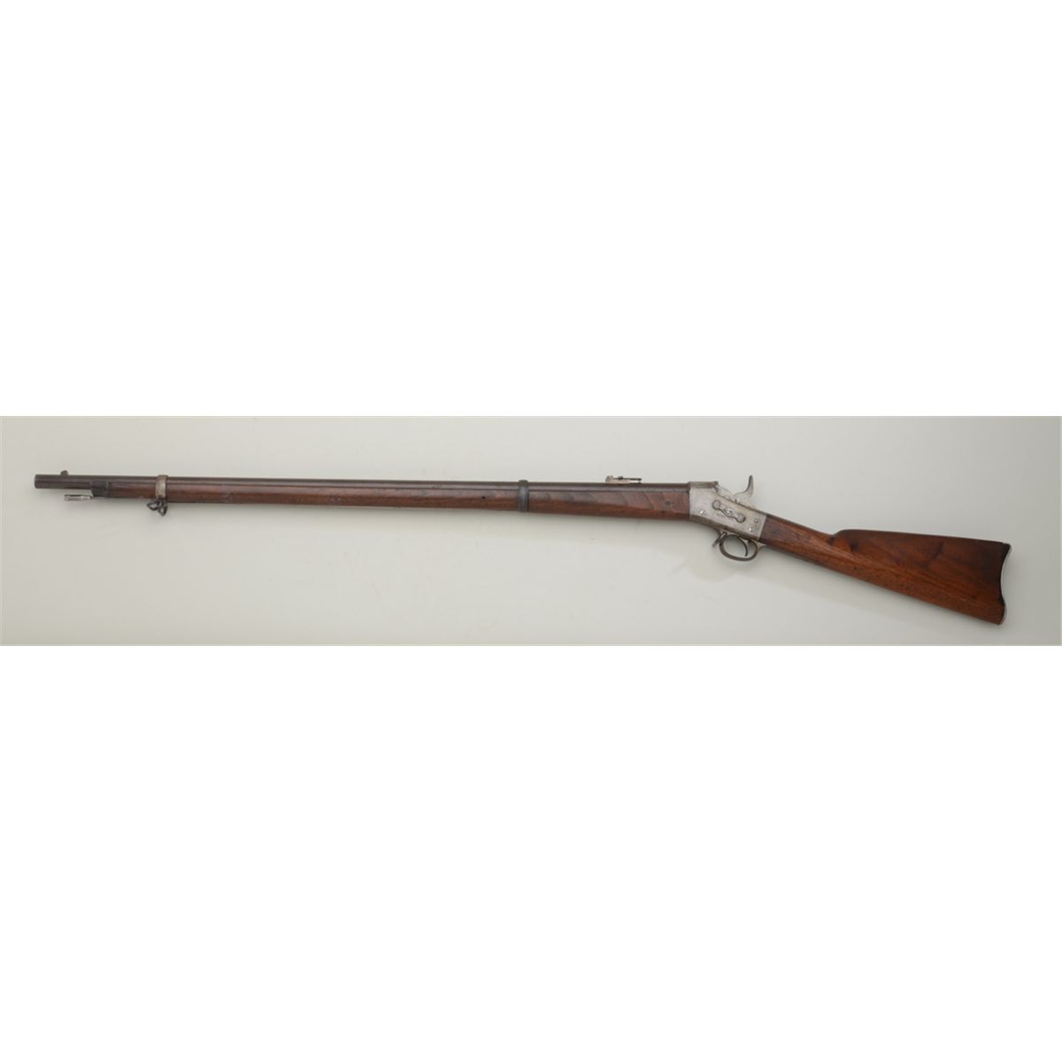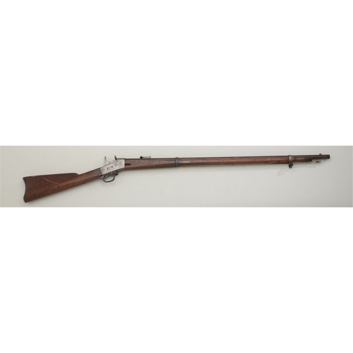 Interesting U.S. Springfield Model 1871 Rolling Block single shot military rifle, .52 cal., 36” barrel, brown finish, case hardened receiver, wood stocks with sharp inspector’s cartouche on left side of buttstock at wrist, sling swivels, iron cleaning rod, top of iron butt plate stamped “US” and with a likely rack number of “37” also stamped. This gun is in overall good condition showing a brown patina on thebarrel and silvery toning to the receiver, good action, rough bore; full length fore end appears to be from another type of U.S. military longarm as the right side of that portion of the stock, at the breech end, hasa milled out area and filled screw hole; the replacement appears to be period however no further information is available concerning this conversion. Est.: $800-$1,600.