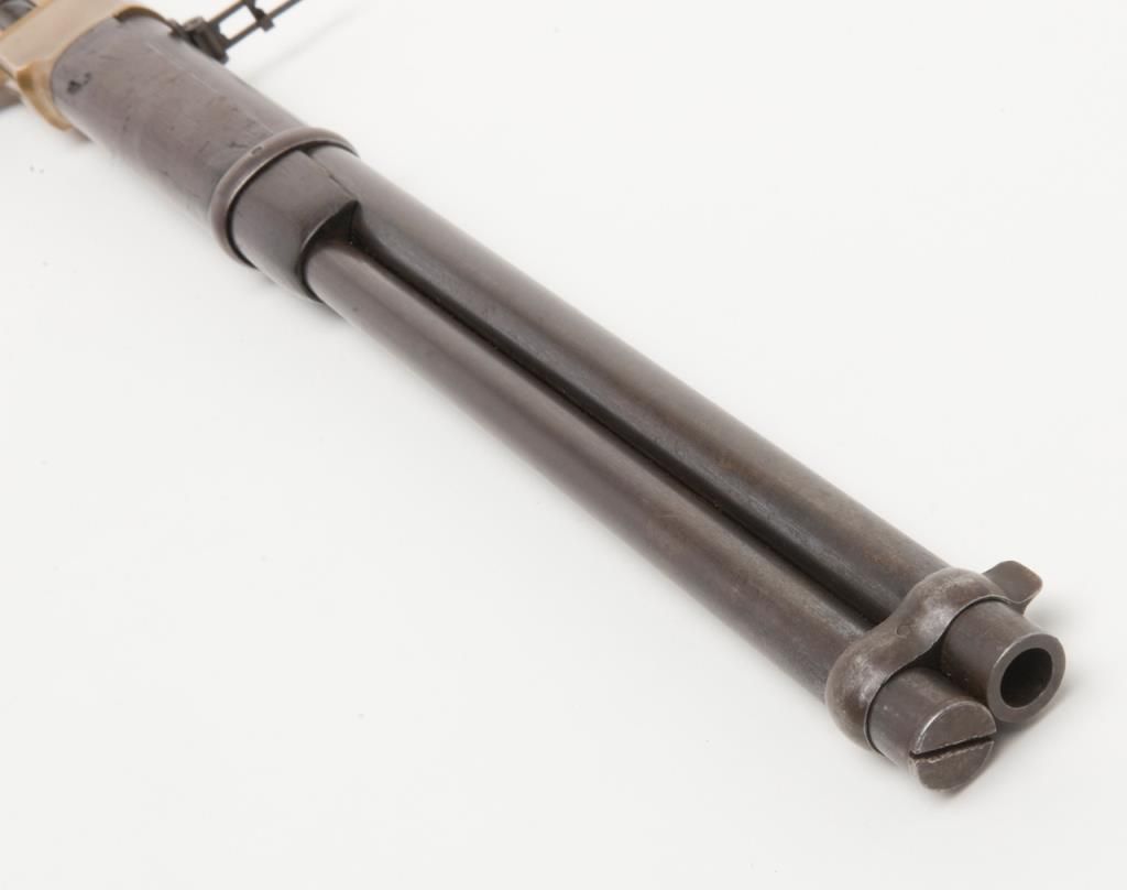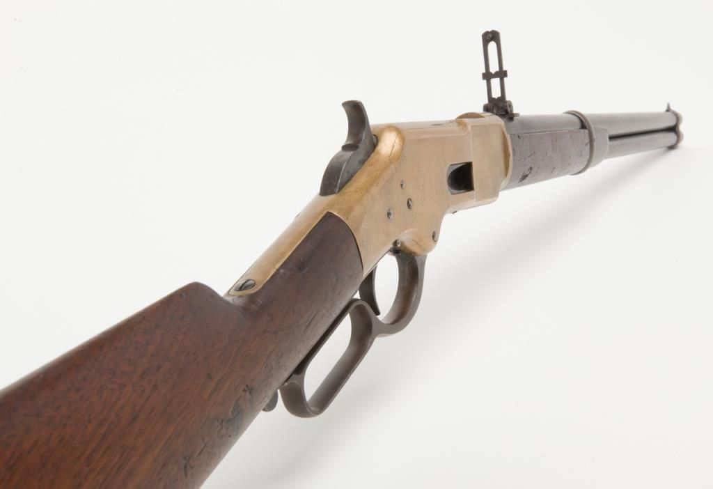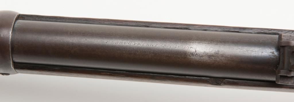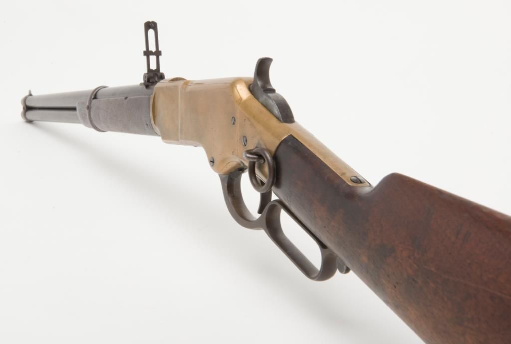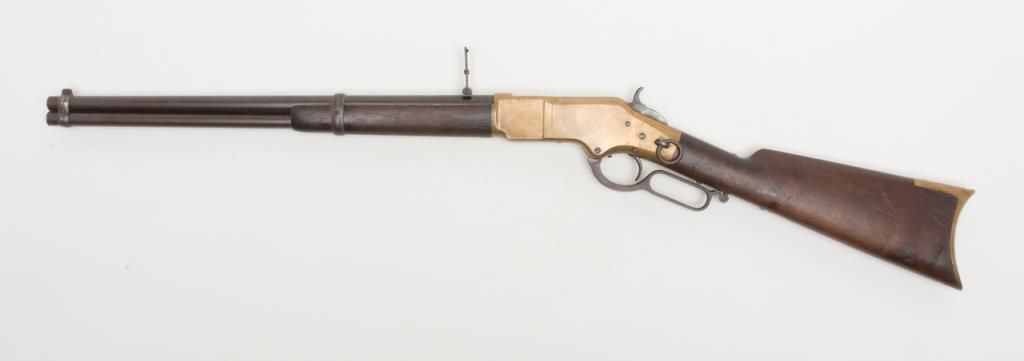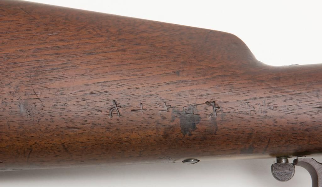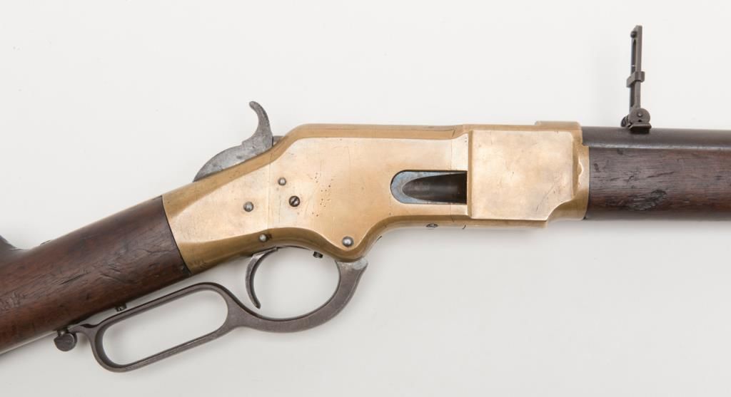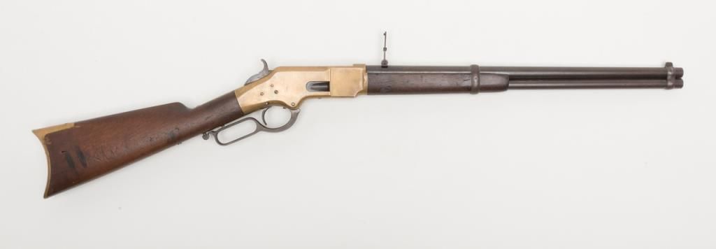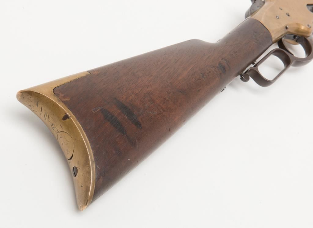 Interesting Winchester Model 1866 lever action SRC, .44 cal., 20” barrel, blue finish, brass receiver, wood stocks with Japanese characters stamped on the right side of the butt stock, #15063 on the inside tang of the carbine (stockand butt stock #14806). This gun is in overall very good condition showing a plum brown patina on the barrel and loading tube mixed with original blue finish, pleasing patina to brass frame, good bore, crisp action, visible barrel address andoverall very good wood stocks with scattered old mars and scratches from carry and storage and some spots of discoloration; most of the Japanese characters are readable. Accompanying the lot is a letter dated May 20, 2007 referencing thiscarbine and indicating it was found by a resident of Tombstone, Arizona years ago in a mine, wrapped in an old pair of dungarees. Also included is an article by Francis Allan, Chip Goddard & Takehito Jimbo regarding Henry rifles and WinchesterCarbines in Japan that notes “The history of the use of the Winchester Model 1866 in Japan is unclear . . .” but goes on to quote author Herbert Houze’s notation that 5,000 Model 1866 carbines were shipped to Japan in 1867. The article also