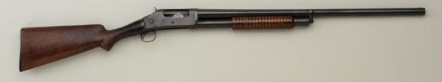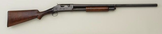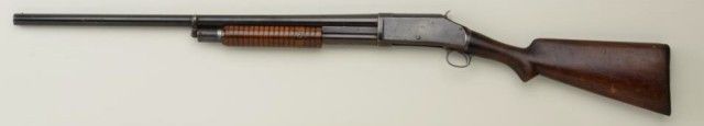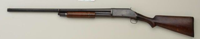 Interesting Winchester Model 1897 pump action shotgun variation, 12 gauge, solid frame, 12” barrel, blue finish, wood stocks, #WRA Co. This gun is in overall good condition showing traces of blue on the receiver mixedwith a plum brown patina and plum brown patina on the barrel with some scratches a couple small old dings from storage; overall crisp action, fair to good bore, good wood stock with some scattered wear and mars tobutt stock; replaced Winchester checkered black hard rubber butt plate; WRA Co. marked over serial number was what Winchester did for a short time (approx. 1900-1903) to guns returned to the plant for repair when theoriginal serial number had been removed or worn off; the Company did this because some retail firms were buying guns directly from other dealers or distributors and not maintaining the Winchester recommended retail pricing structure; by removing the serial number, these “price pirates” felt they could get guns repaired without Winchester knowing who the gun was originally sold to . . . the practice was ended when serial