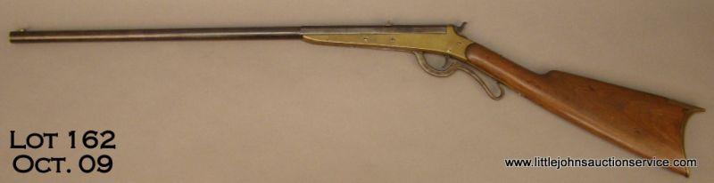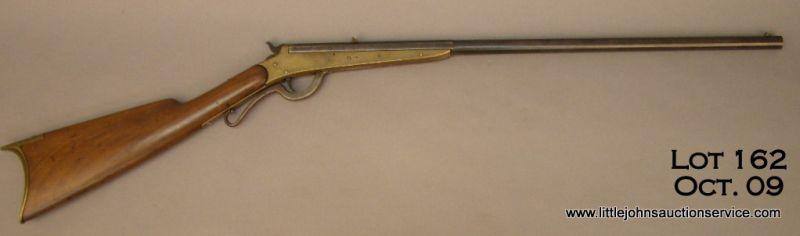 Interesting and rarely seen Beal’s single shot breech loading rifle, .30 cal., 25” half round/half octagon barrel, brass frame, wood butt stock, #431. This gun is in overall good condition with dark patina on barrel assembly with approx.50% barrel address visible, pleasant patina to frame, good wood with scattered nicks and mars from storage and a little undersized from shrinkage or light sanding; with old collection tag attached. Est.: $400-$800.