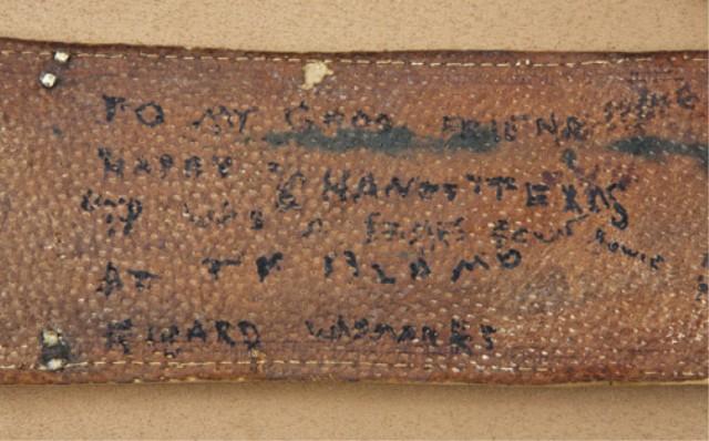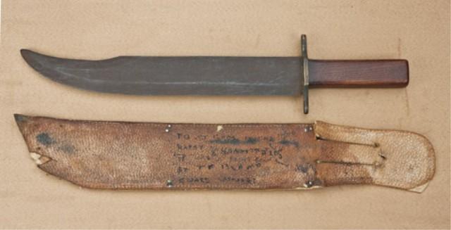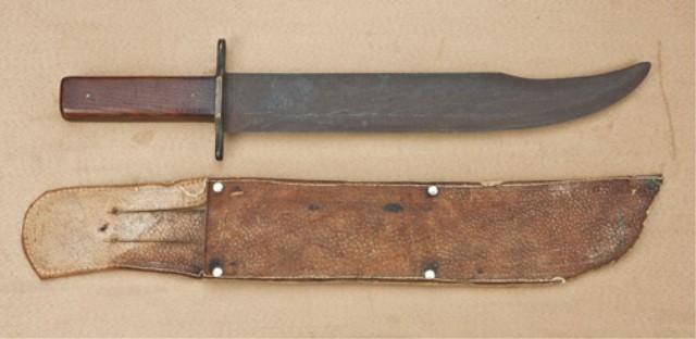 Interesting bowie knife with hand-forged blade. Blade measures 13-1/2”, knife is 18-3/8” overall. Blade shows a pronounced clip point which extends 4-5/8” back from the point. The blade shows forging, a handmade brass guard, and a pinned hardwood grip which may be hickory or oak with pronounced grain. The hilt shows a dark patina, the grip is good to very good with some staining. The blade is somewhat thin and shows edging and forging marks and is slightly irregular like it was made by a blacksmith. We would date this knife approx. 1820 to 1860. A hand-made simple and cheap leather scabbard from the 1950’s is penned on black letters on the back, “To my good friend, Harry ___ Texas, ___ Scout Bowie, ____ at the Alamo, Richard Widmark”. This knife was gifted to Col. Orbelo and many original knives and studio knives were made for the movies like the Iron Mistress" and the "Alamo". This knife we believe is authentic to the 19th century other than the"scabbard which is a studio addition. From the William R. Orbelo collection. Est: $1,000 - $3,000