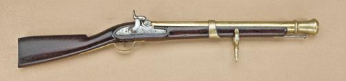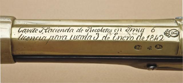 Interesting brass-barrel blunderbuss with tower and GR lock showing crown and heavy bell-mouth brass cannon barrel which is period script engraved “Cavite Hacienda de Recoletos en Ymus 6 / licencia para usarla 3 de Enero de 1842”. The breech is also engraved with R in circle with sunburst at top. The left side of the breech shows British proofs and TH barrel maker’s stamp. The lock and breech show conversion to percussion from flint. The lock markings are period forgeries and of the type known to be found on Mexican arms of the 1830’s and 40’s, including muskets used in the Alamo. These British arms were always popular and Mexico was a prime market for forged British arms. The stocking is typical Mexican or South American, as are the mounts, buttplate, and bracket. The bracket mount to be used as wall gun. The overall condition is good to very good showing some pitting on the lock. Brass shows good patina. Stock shows some dings, mars, slight losses, and poor fitting around the lockplate. A period ramrod is included. The action is good, engraving on the breech is very deep and appears genuine in style. From an old Texas collector. The gun measures 39” overall, 22” heavy canon type