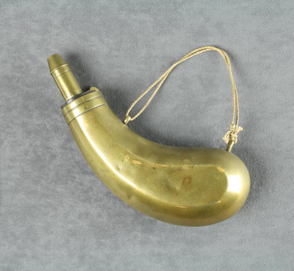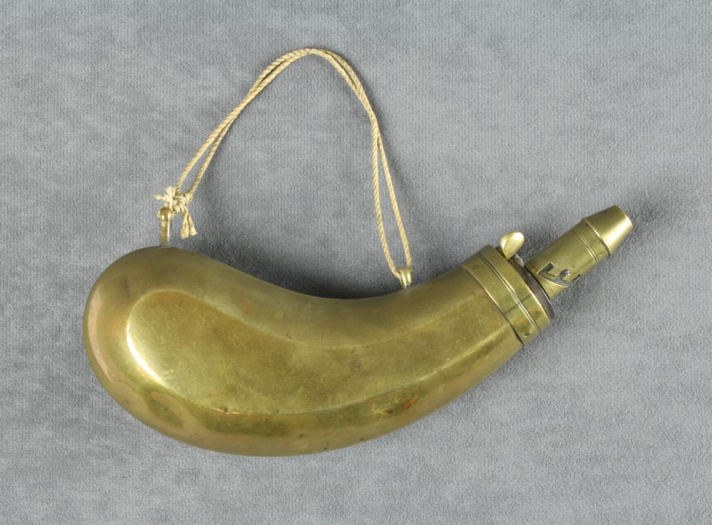 Interesting curved profile brass shotgun flask with graduated charger, approx. 8” overall and in very good condition showing some old dents and an old string hanging cord. Est.: $200-$300.