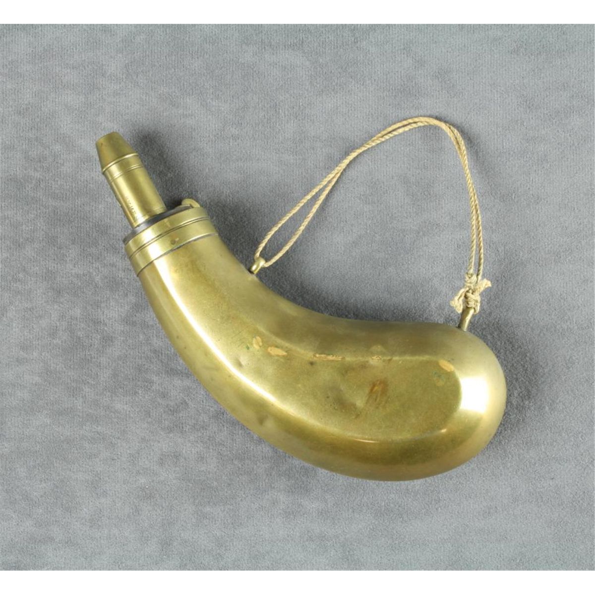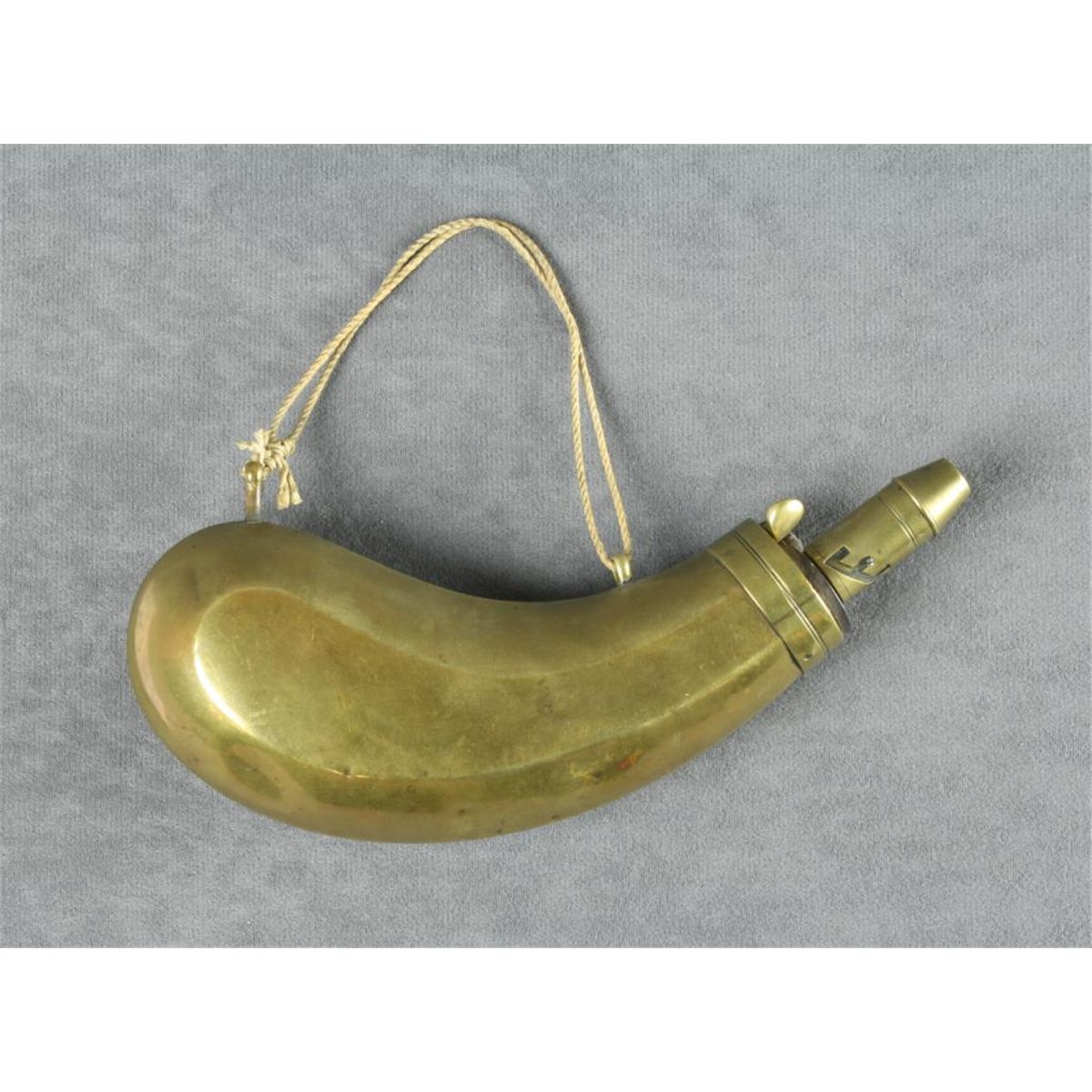 Interesting curved profile brass shotgun flask with graduated charger, approx. 8” overall and in very good condition showing some old dents and an old string hanging cord. Est.: $150-$300.