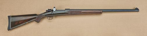 Interesting custom sporting rifle, .458 caliber, on 98 Mauser military action, showing heavy round barrel, Wesley Richards & Co marks, British proofs, Lyman type rear sight, serial #41765. The rifle shows a 26-1/2” heavy round barrel measuring approx. 7/8” across the muzzle. Shows a dark matte blue refinish and a refinished stock which shows some poor workmanship where holes were filled on left side. Action is good, bore is near excellent. The quality of the refinishing is somewhat amateurish and could be improved. Shows a very good barrel and action. Est: $400 - $800