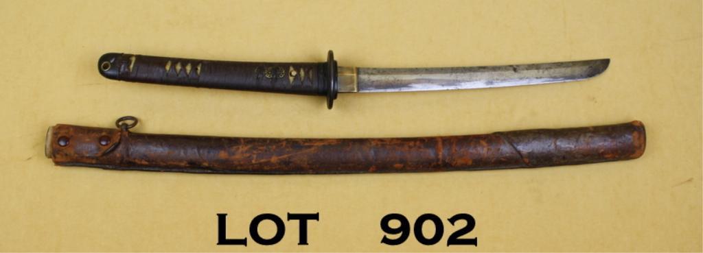 Interesting cut down Japanese samurai sword and military leather covered scabbard, sword is approx. 25” overall with an approx. 14” cut down blade in worn condition with scattered scratches and dings to the edge and some scattered areas of erosion and pitting; plain iron mounts, ray skin wrap with two menuki and brown string wrapped grip; full-length military-type scabbard with scuffed leather cover; tang is signed and should be further researched. Est.: $50-$100.