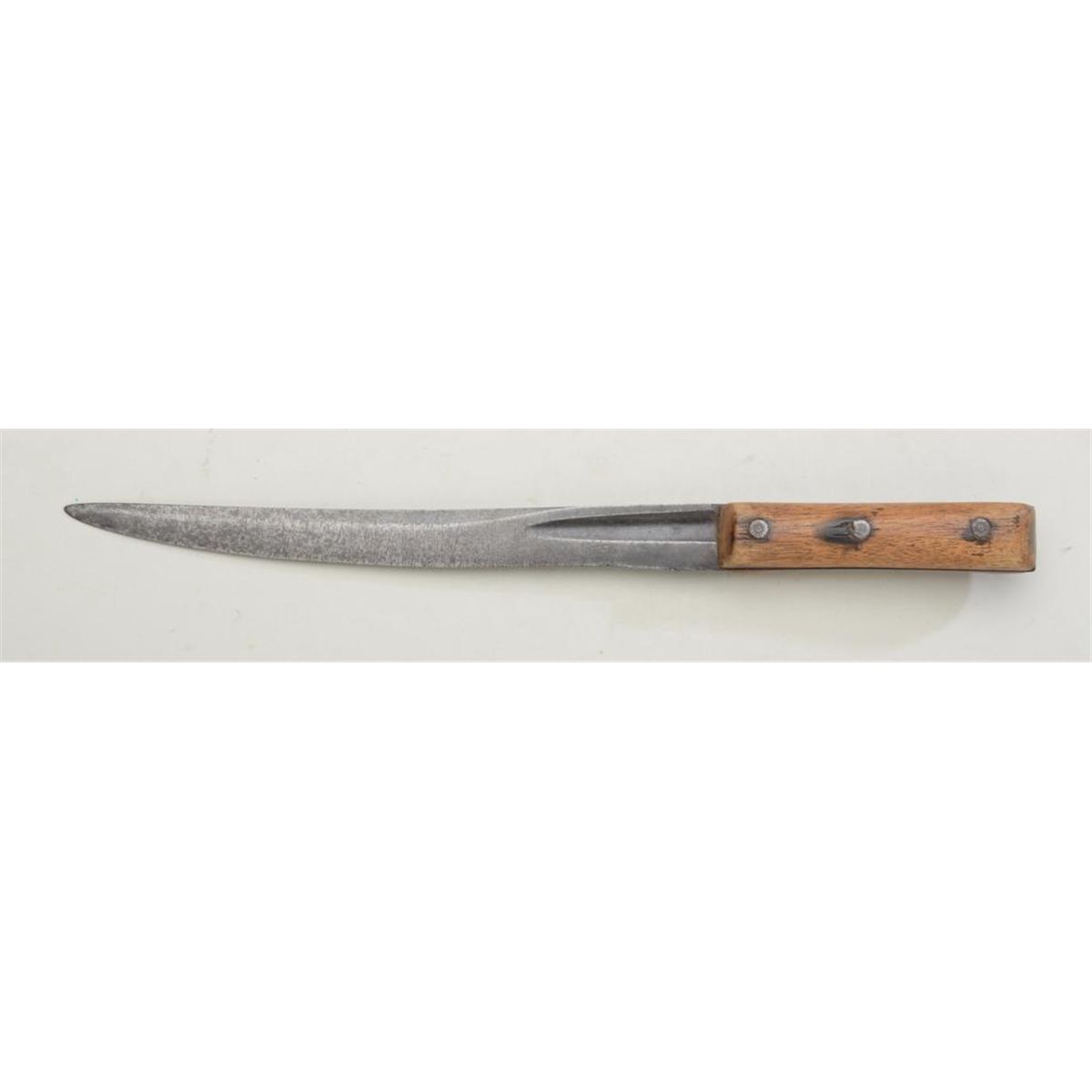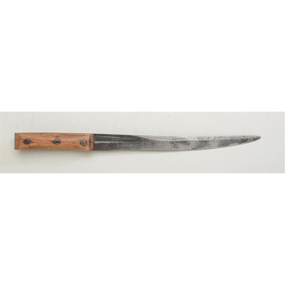 Interesting early American unmarked long knife, approx. 15-1/2” overall with an approx. 10-1/2” blade with groove to both sides at the hilt extending approx. 3” forward; wood grip is worn with three ironrivets; blade shows a dark patina. $300-$400.