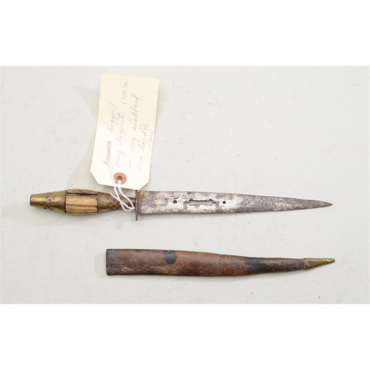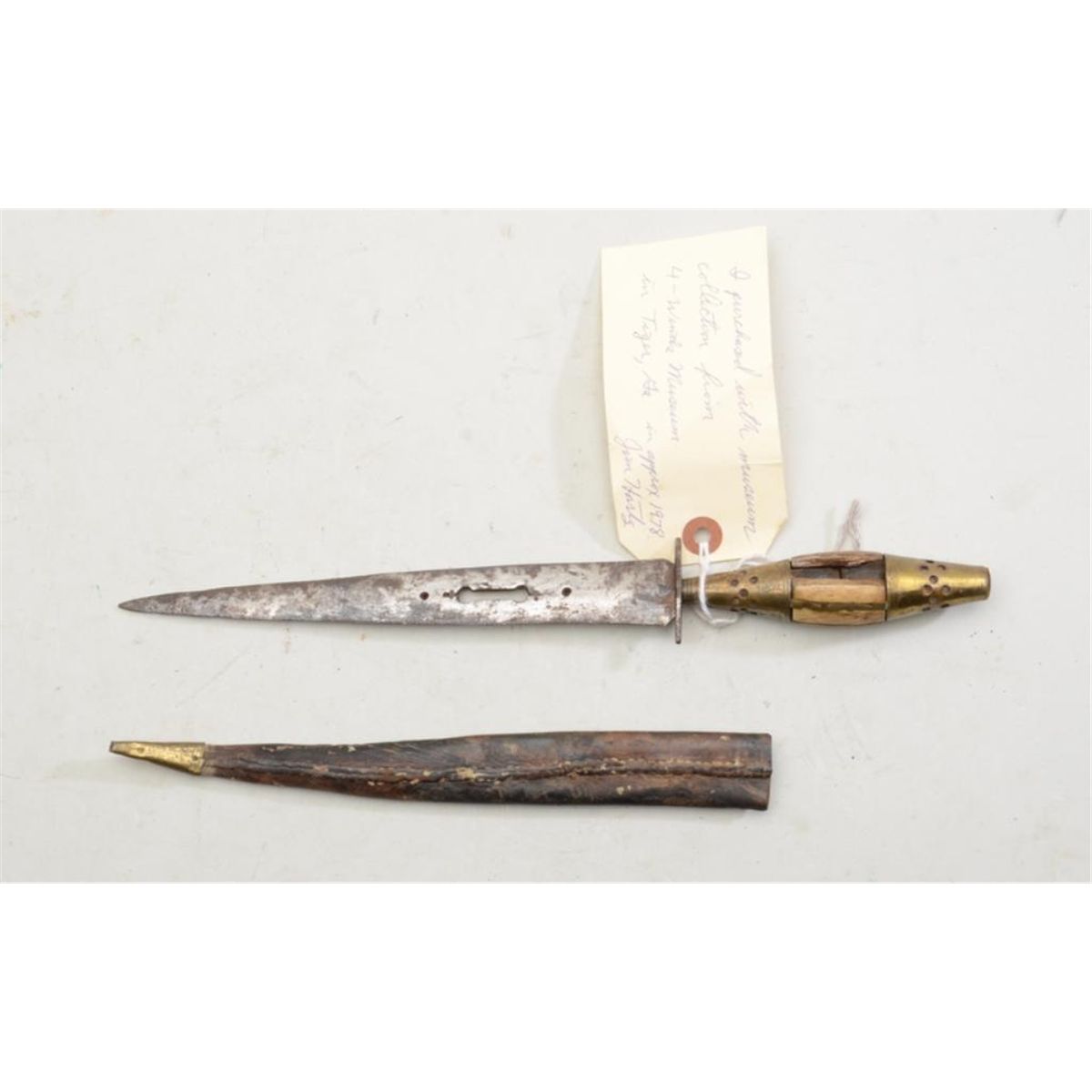 Interesting early Spanish dagger/plug bayonet with old leather sheath and brass tip with tag attached stating in part “ . . . I purchased with museum collection from 4-winds Museum in Tiger, GA in approx. 1978”; inoverall relic like condition; blade shows scattered areas of erosion and decorative cut outs in center of blade; grip is bone panels over wood with several panels missing; brass pommel and cap piece at simple iron guardarea; leather sheath is fair overall. Est.: $100-$150.