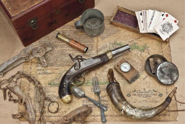 Interesting ensemble consisting of European military pistol, probably French or Belgain, converted from flintlock to percussion, brass tacked, fair condition, wood shows losses and opening around the metal, a great deal of repair, refinish, restoration, and cleaning. The pistol is contained within a hand-made old carrying case which straps it in the lid. The case contains traps, tin cup, compass, small pocket telescope, knife fork and spoon, and a 19th century powderhorn that is painted in carved decoration “I have hunt, fish, and trapped in VA and KY, and Mar.la since yr 1847. Mt. in Va please…” The rest illegible. The horn is crudely homemade. Most interesting is a map measuring approx. 23” by 17-1/2. Hand-drawn and compiled 1799 by James D. Lee. Map is hand drawn and laid down on paper, and posted to a heavier material. The map is finely drawn and in good condition, showing Daniel Boone exploration areas, and other information. The ma has long been included with this set, which shows the initials VAM 1849 on its top. The exterior of the case is painted red and shows brass hardware with green felt interior. With a small gaming set containing cards and pegs for cribbage. Est: